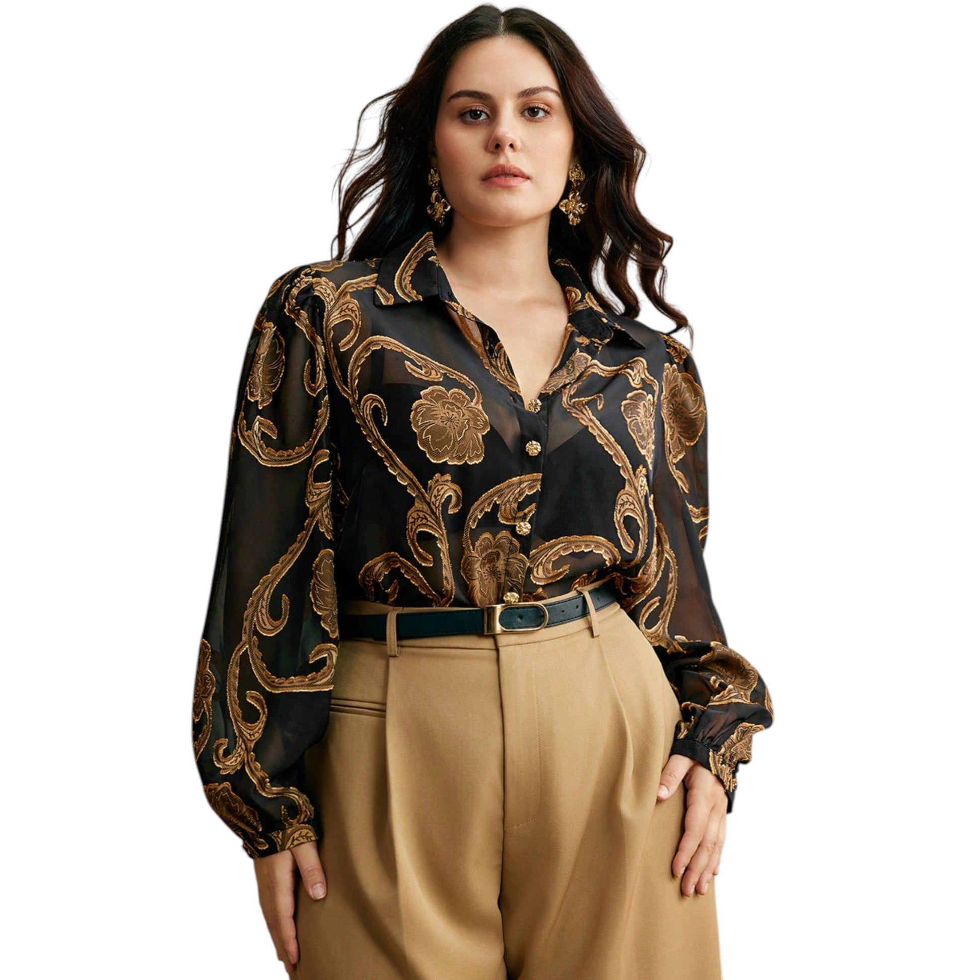 Címke nélküli, fekete, arany színű virágmintás, áttetsző, galléros, gombos, hosszú bő ujjú.