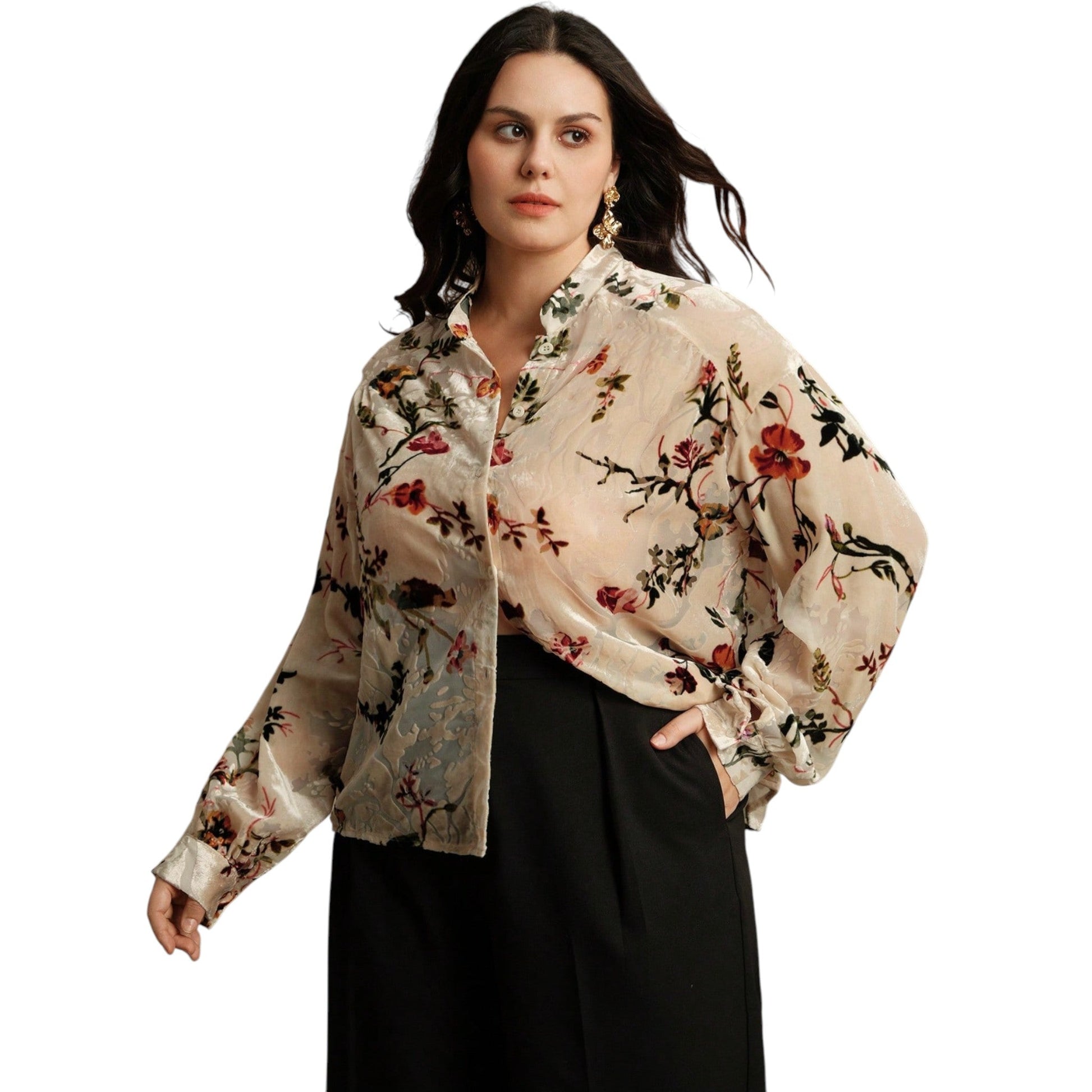 Címke nélküli, bézs, virágmintás, bársony anyagú, áttetsző, galléros, gombos, hosszú ujjú.