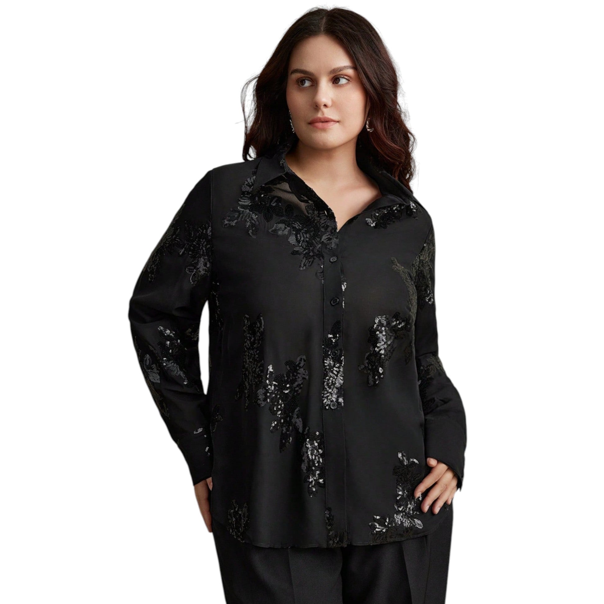 Címke nélküli, fekete, galléros, gombos, hosszú ujjú, áttetsző, flitteres díszítéssel.