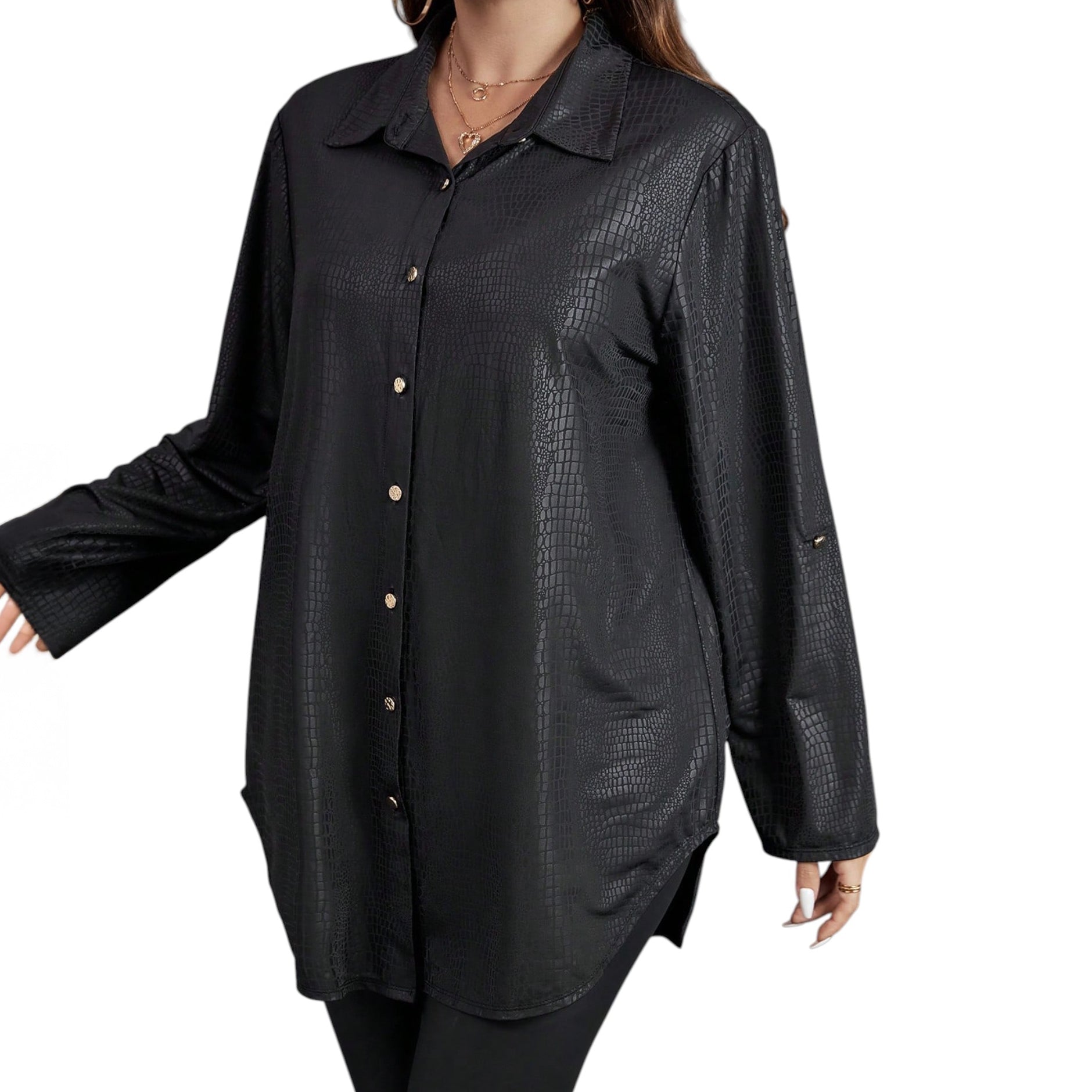 Címke nélküli, fekete, hosszú ujjú, gombos, galléros, bőrhatású ing.