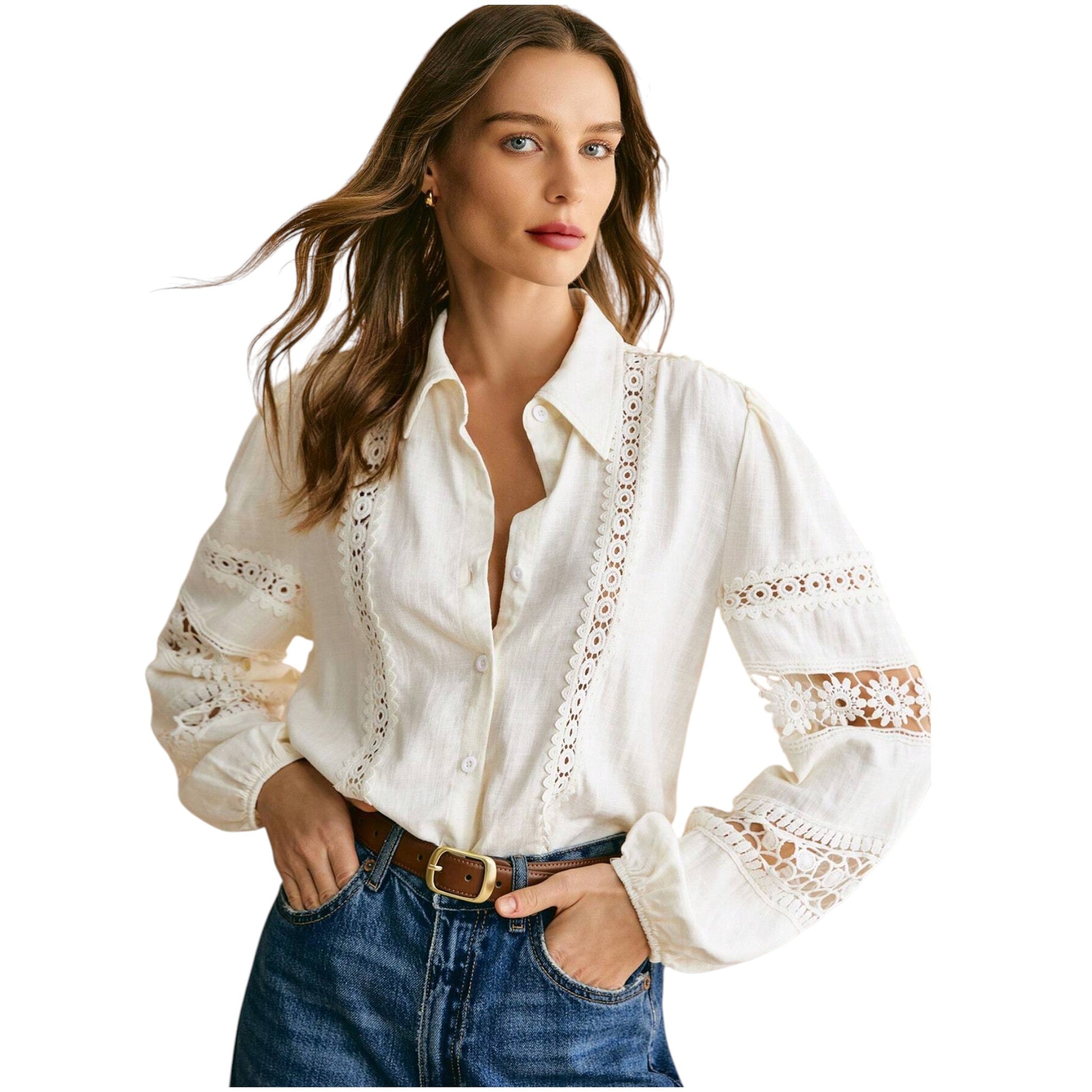 Címke nélküli, vajszínű, hosszú ujjú, galléros, gombos, csipkés.