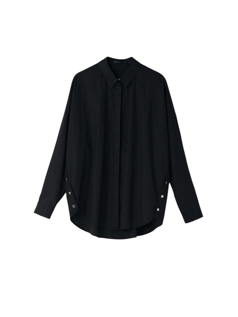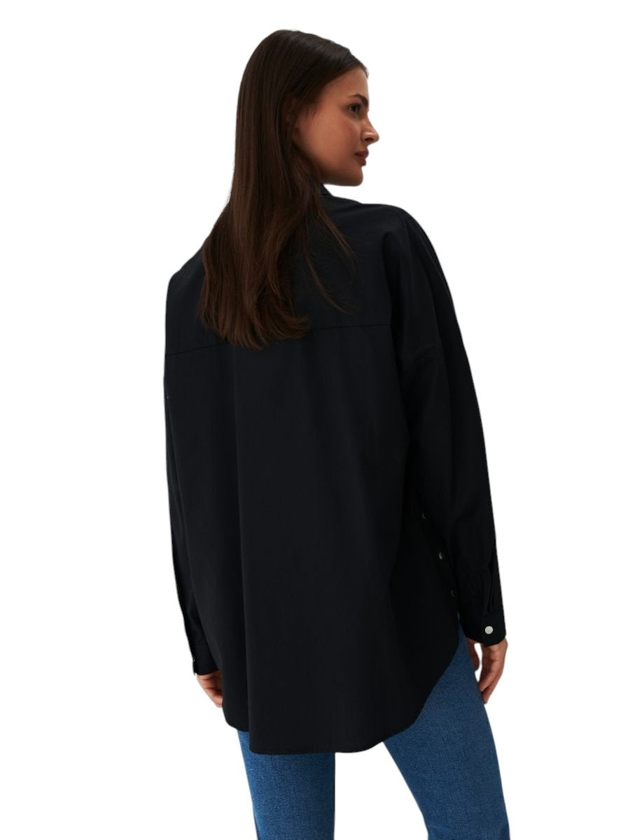 Címke nélküli, fekete, szövet, laza/oversized fazon, hosszú ujjú, galléros, elöl rejtett gombolás, oldalt patentos hasítékok, lekerekített alj.