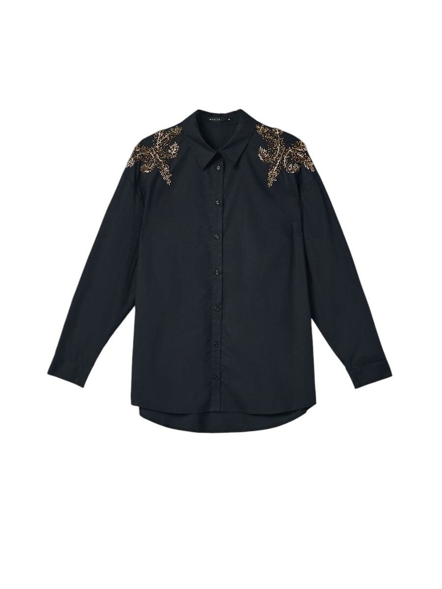 Címke nélküli, fekete, pamut/szövet, klasszikus fazon, hosszú ujjú, galléros, elöl gombos, vállakon arany színű hímzéssel/díszítéssel, lekerekített alj.