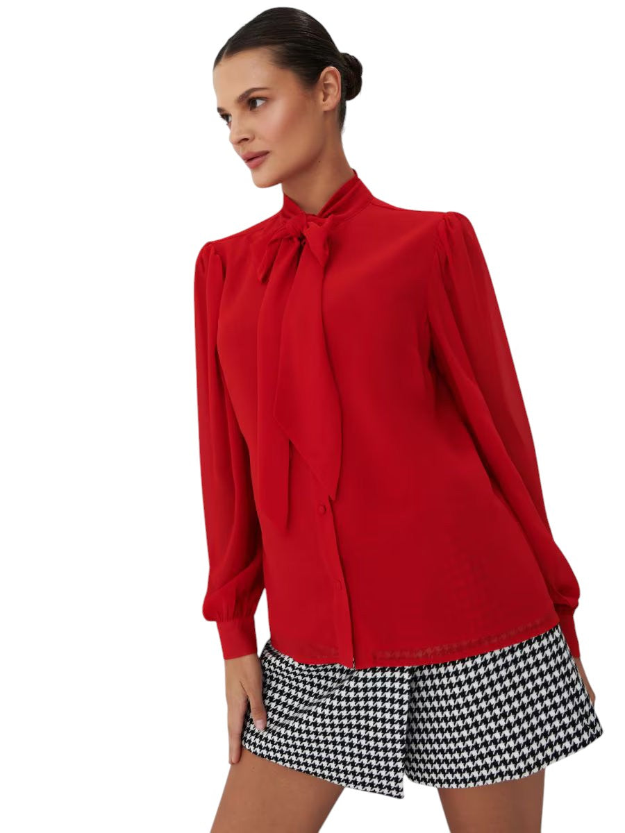 Címke nélküli, piros, sifon/könnyű szövet, elegáns fazon, hosszú ujjú, megkötős masnival a nyakánál, elöl részben gombos.