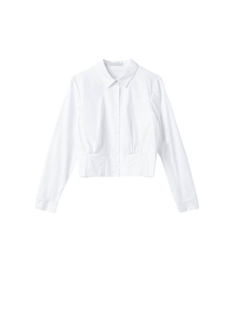 Címke nélküli, fehér, pamut (feltételezett), crop top/rövidített fazon, hosszú ujjú, galléros, elöl gombos, derékrészen szűkített kialakítás.