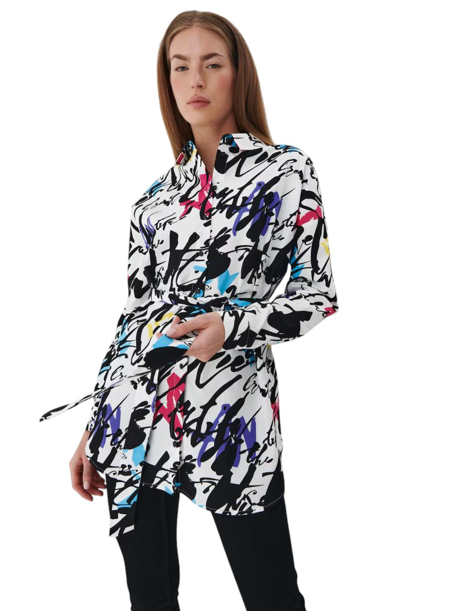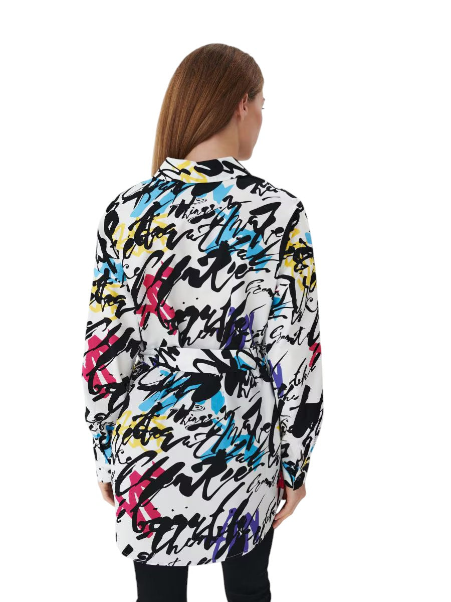 Címke nélküli, fehér alapon többszínű absztrakt minta, szövet, normál fazon, hosszú ujjú, galléros, elöl gombos, deréknál azonos anyagú megkötős övvel.