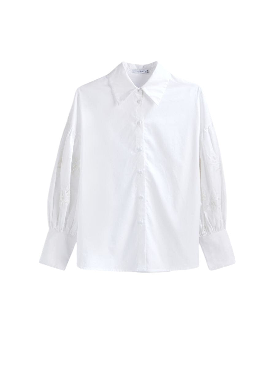 Címke nélküli, fehér, pamut, klasszikus fazon, hosszú, hímzéssel díszített puffos/ballon ujjú, galléros, elöl gombos, széles mandzsettával.