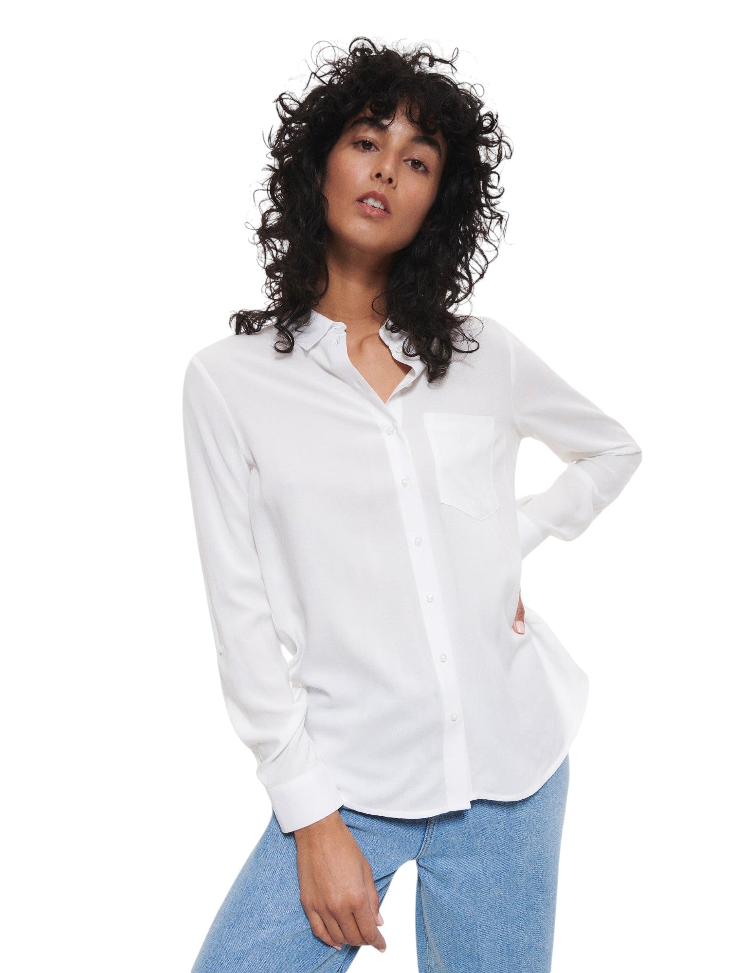 Címke nélküli, fehér, viszkóz/könnyű szövet, klasszikus fazon, hosszú ujjú (felgombolható pánttal), galléros, elöl gombos, egy mellzsebbel.