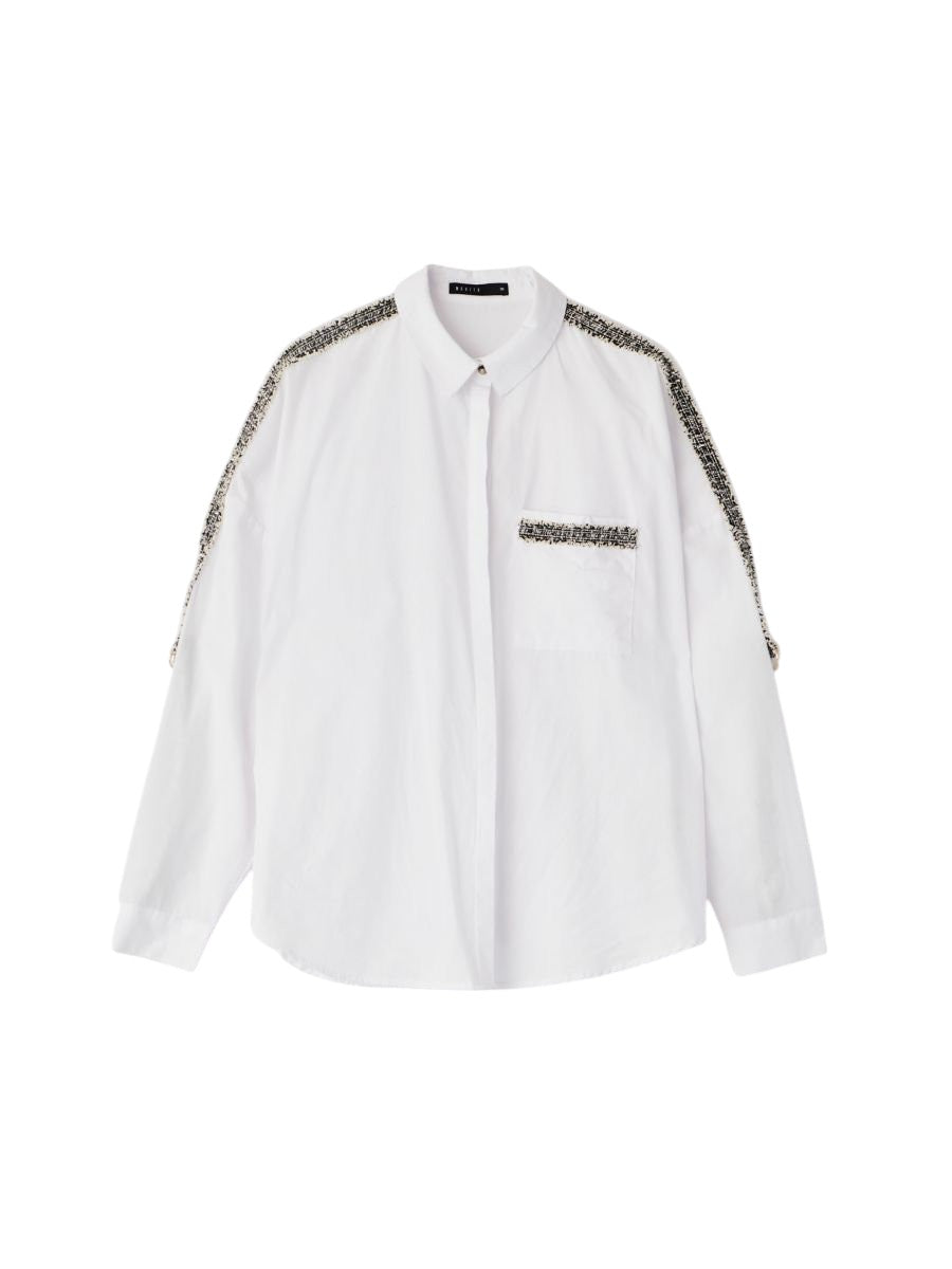 Címke nélküli, fehér, pamut/szövet, klasszikus fazon, hosszú ujjú, galléros, elöl gombos, vállakon és zsebszegélyen tweed/texturált díszítéssel.