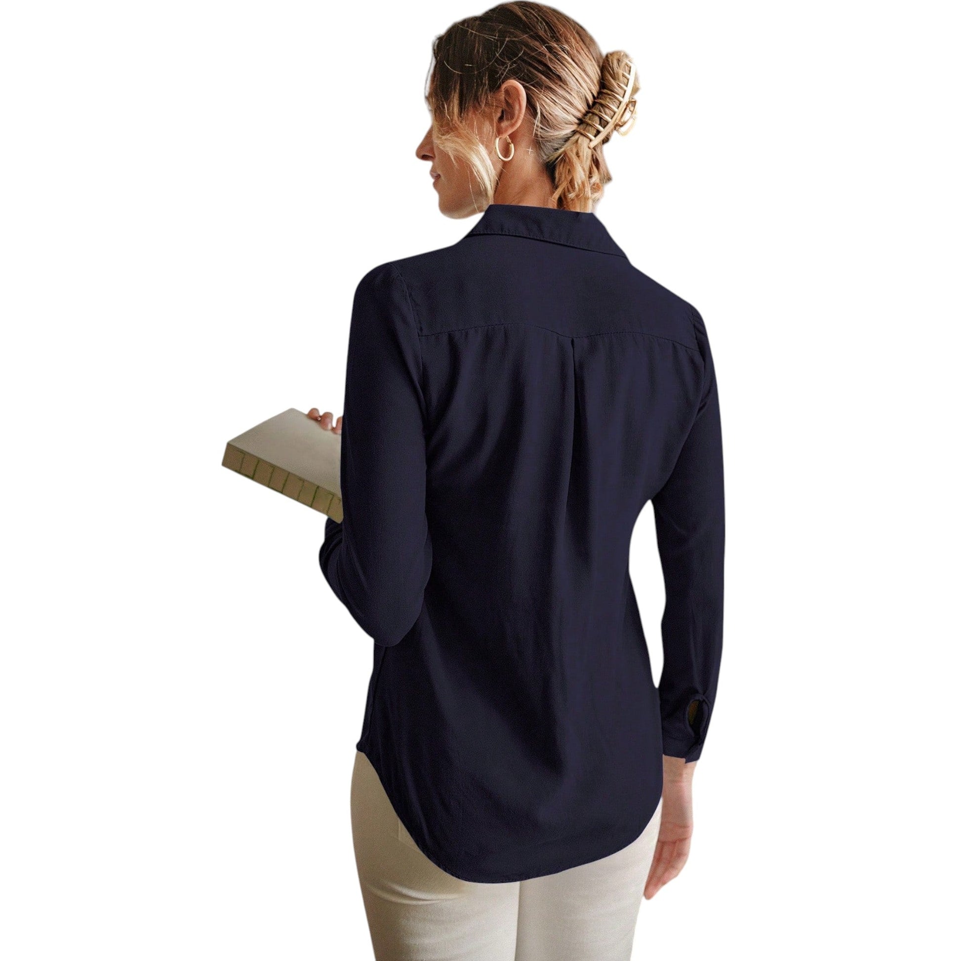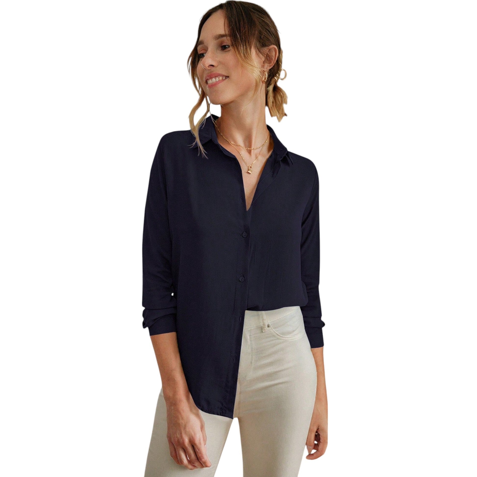 Címke nélküli, sötétkék, hosszú ujjú, galléros ing, elől gombos rögzítéssel, aszimmetrikus alsó szegéllyel.