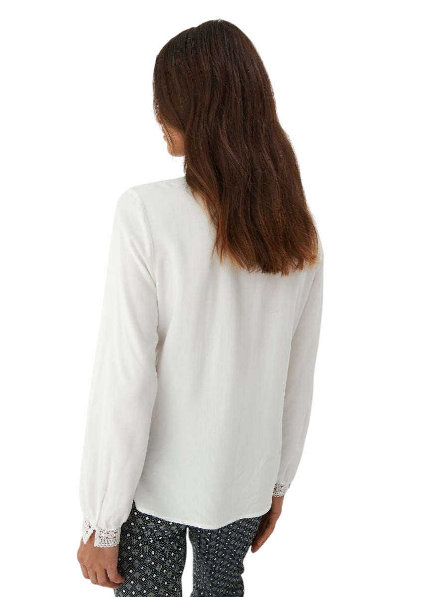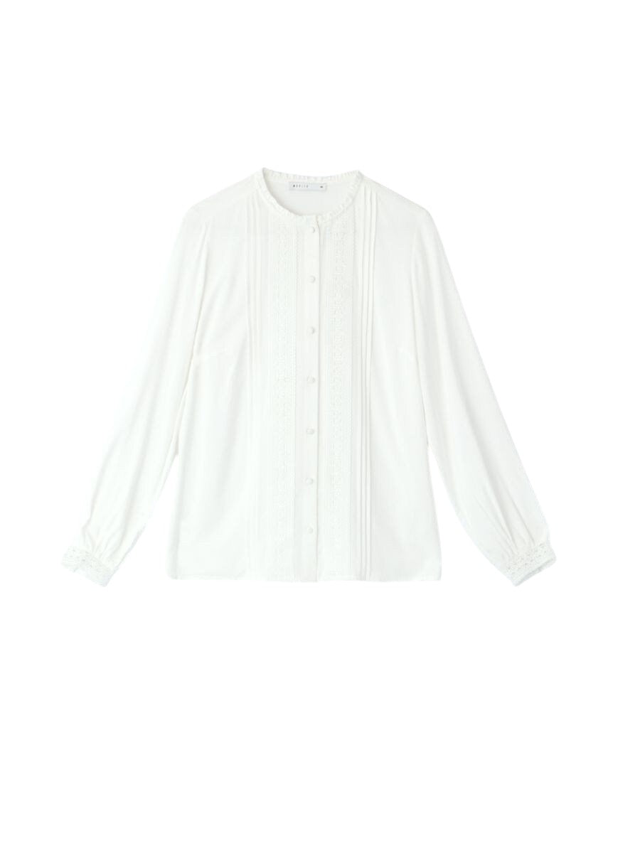 Címke nélküli, fehér, pamut/könnyű szövet, romantikus stílusú, hosszú ujjú, állógallér/kerek nyak, elöl paszományokkal és csipkebetétekkel, gombos.
