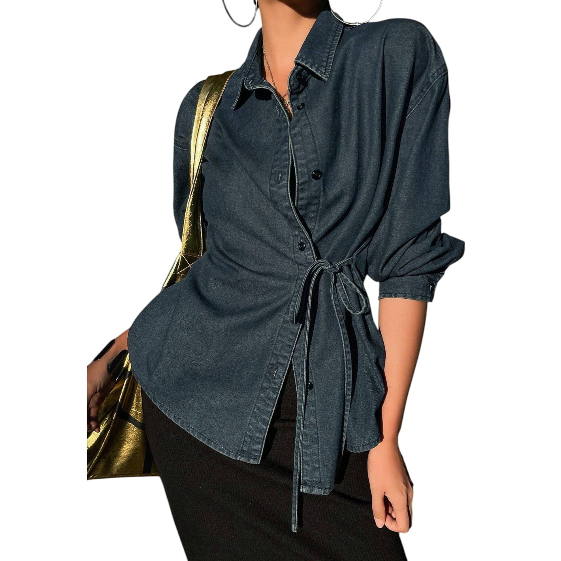 Címke nélküli, sötétkék, hosszú ujjú, galléros, elöl gombos záródás, elöl megkötős részlettel, hosszú, egyenes szabású.