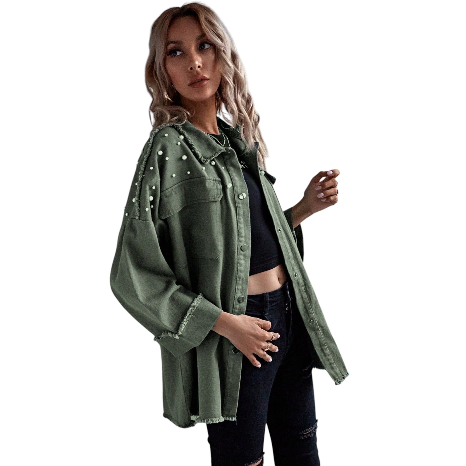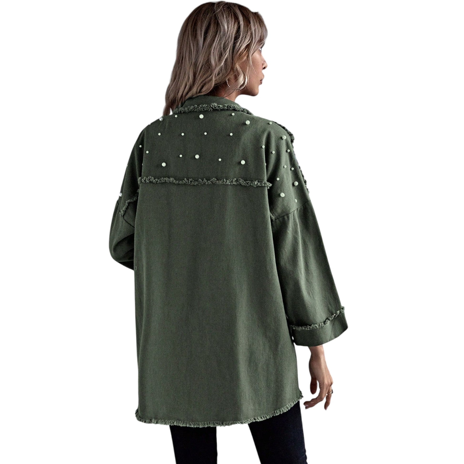 Címke nélküli, zöld, farmer anyagú, szegecses és gyöngyös díszítésű, hosszú ujjú ing, elöl zsebekkel, nyers szélű szegéllyel.