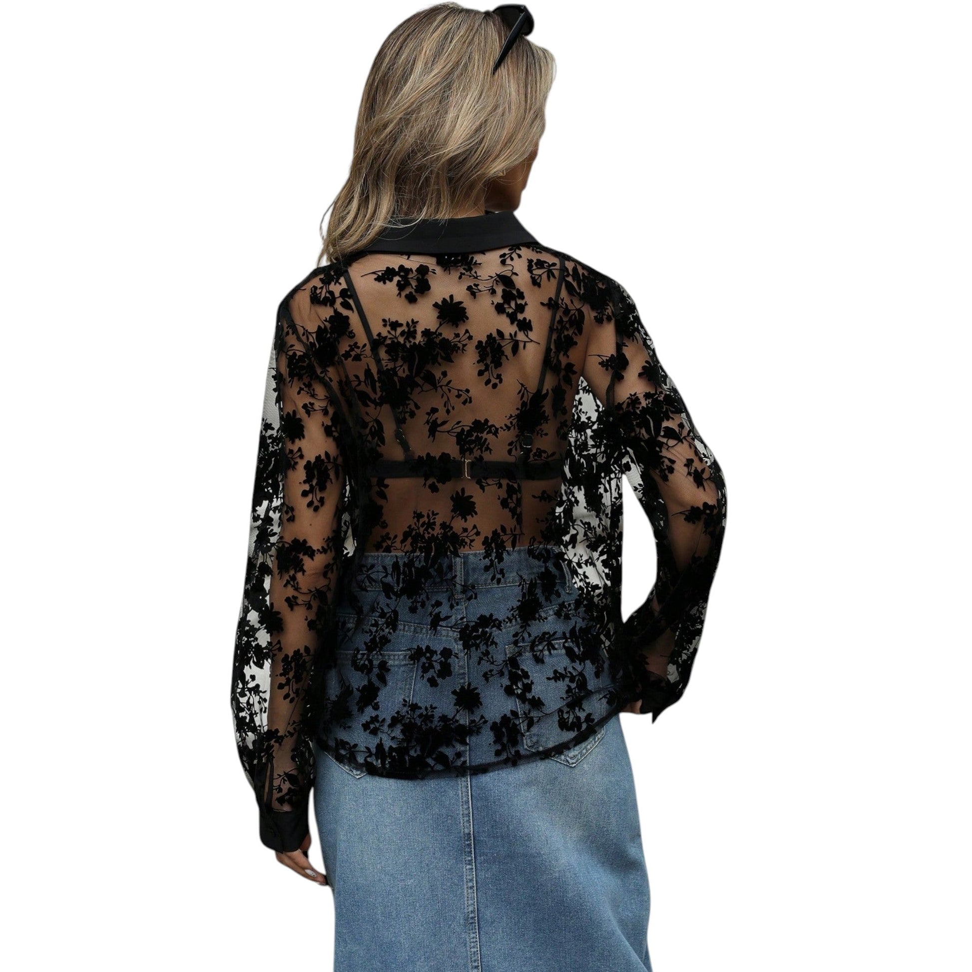 Címke nélküli, fekete, áttetsző, virágmintás, galléros, hosszú ujjú ing.
