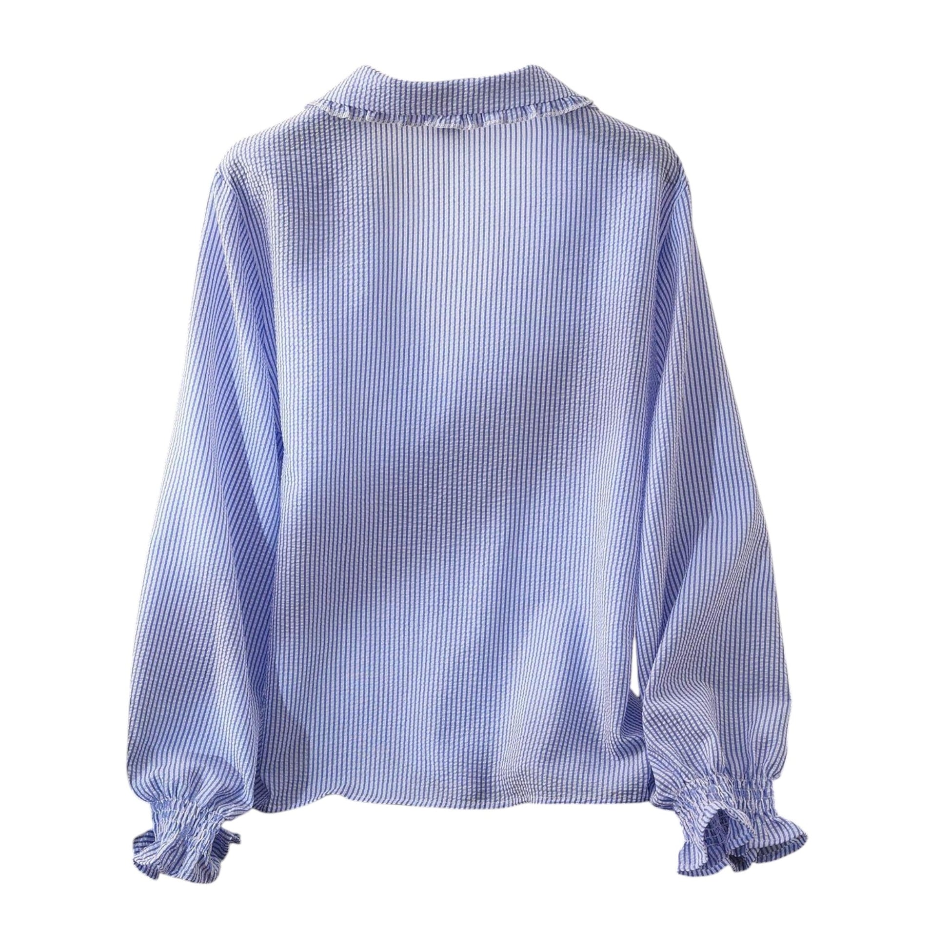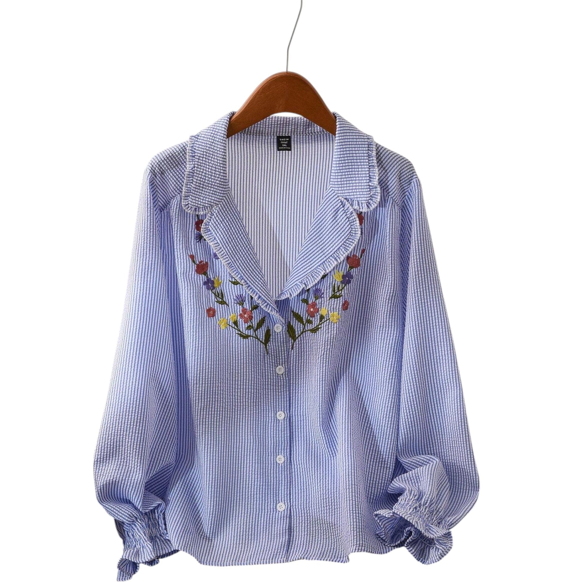 Címke nélküli, kék és fehér csíkos blúz, hosszú ujjú, gallérral és elől hímzett virágmintával.