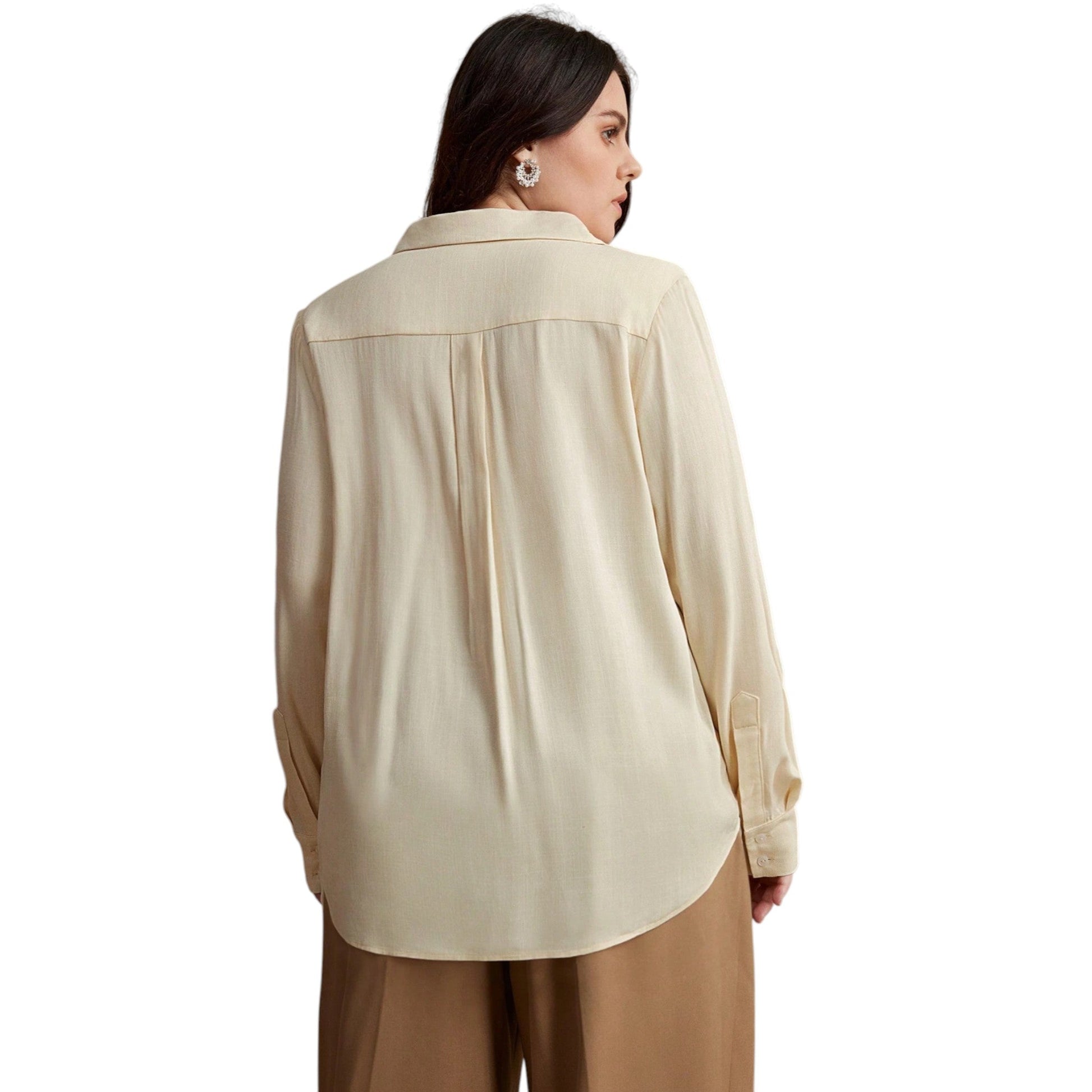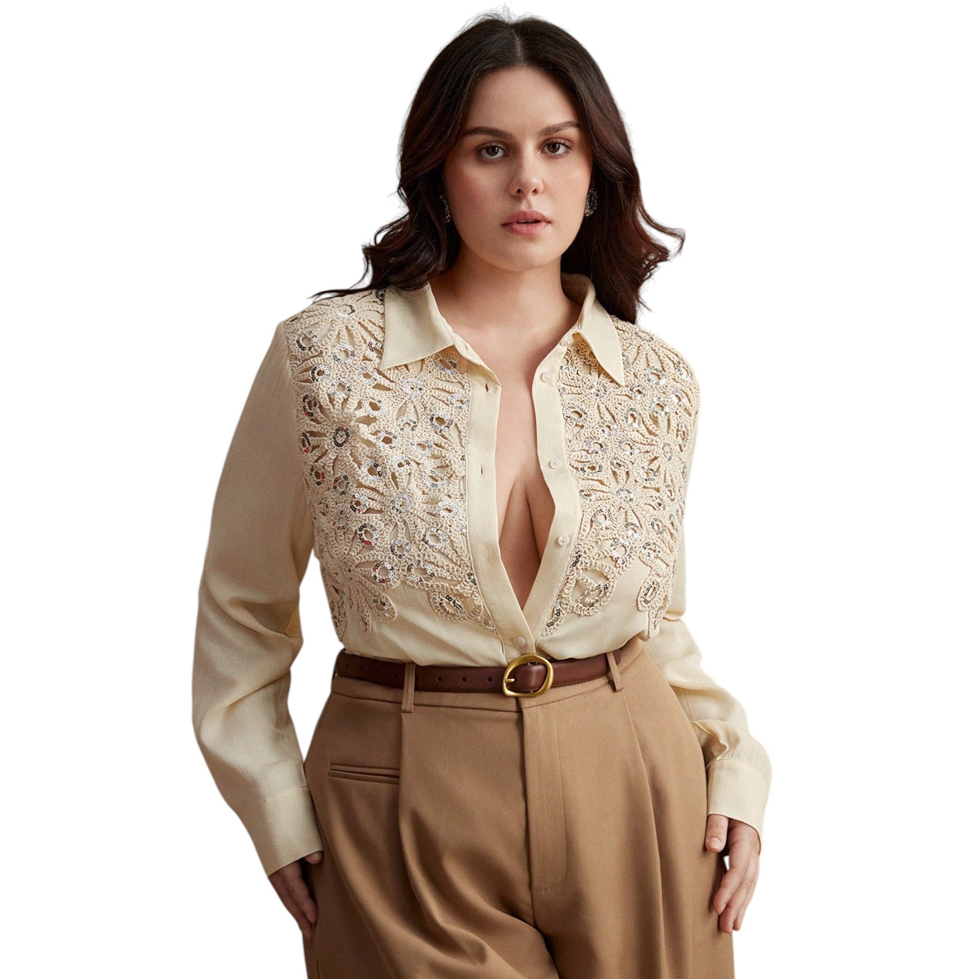 Címke nélküli, ekrü, galléros, gombos, hosszú ujjú, mellkason hímzett és flitteres díszítéssel.