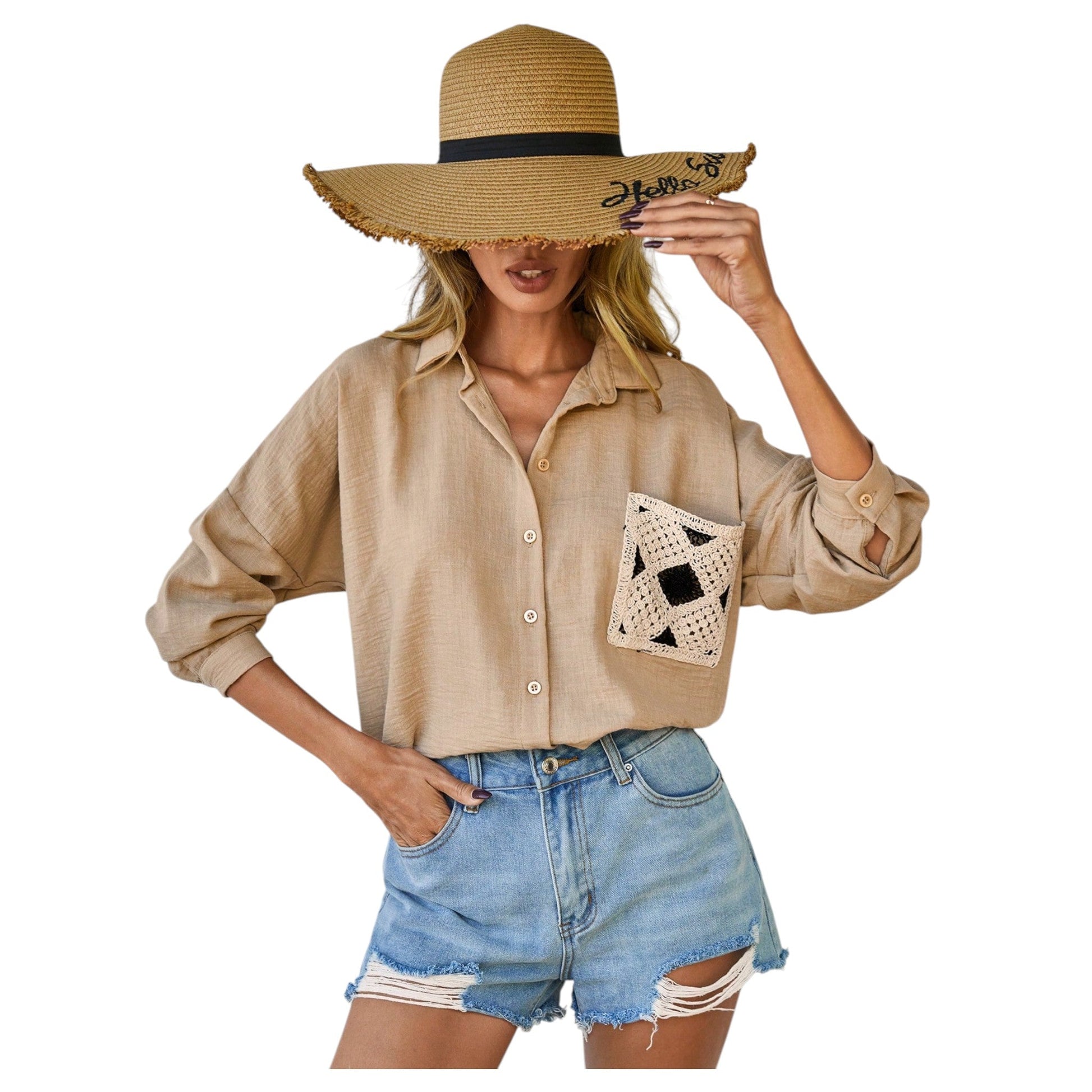 Címke nélküli, drapp, galléros, gombos, hosszú ujjú, mellzsebbel, horgolt díszítéssel a zsebén.
