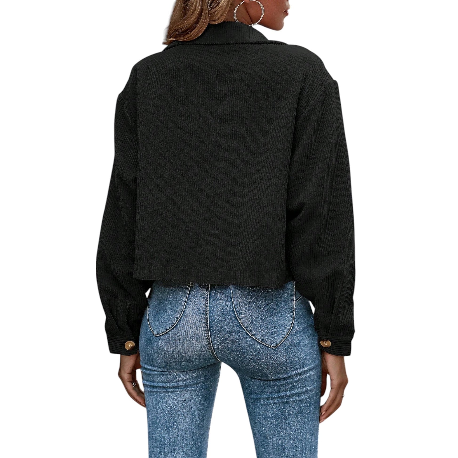 Címke nélküli, fekete, kordbársony anyagú, galléros, hosszú ujjú, gombos, két mellzsebbel, crop fazonú.