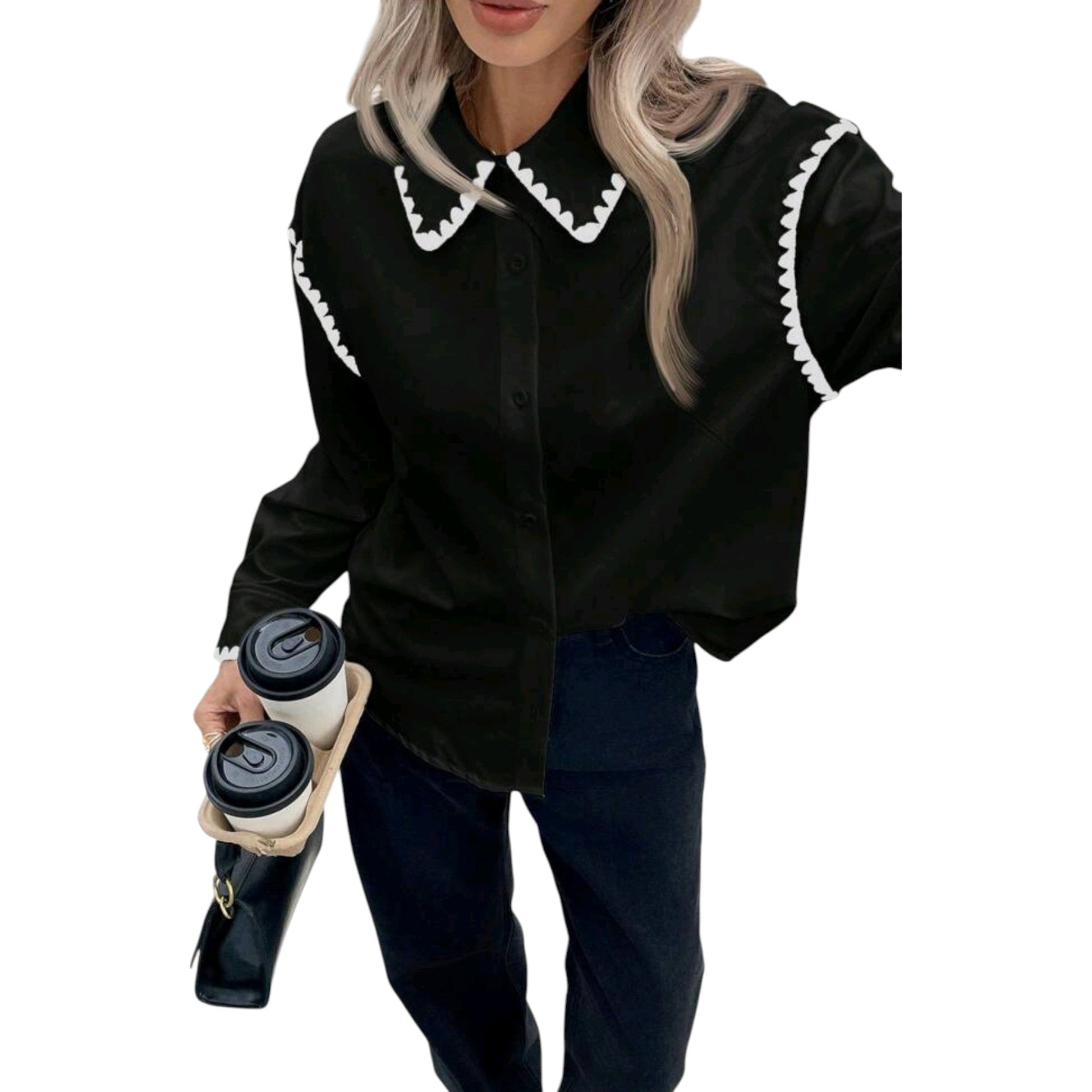 Címke nélküli, fekete, galléros, hosszú ujjú, gombos ingblúz fehér horgolt szegélyű gallérral és mandzsettával