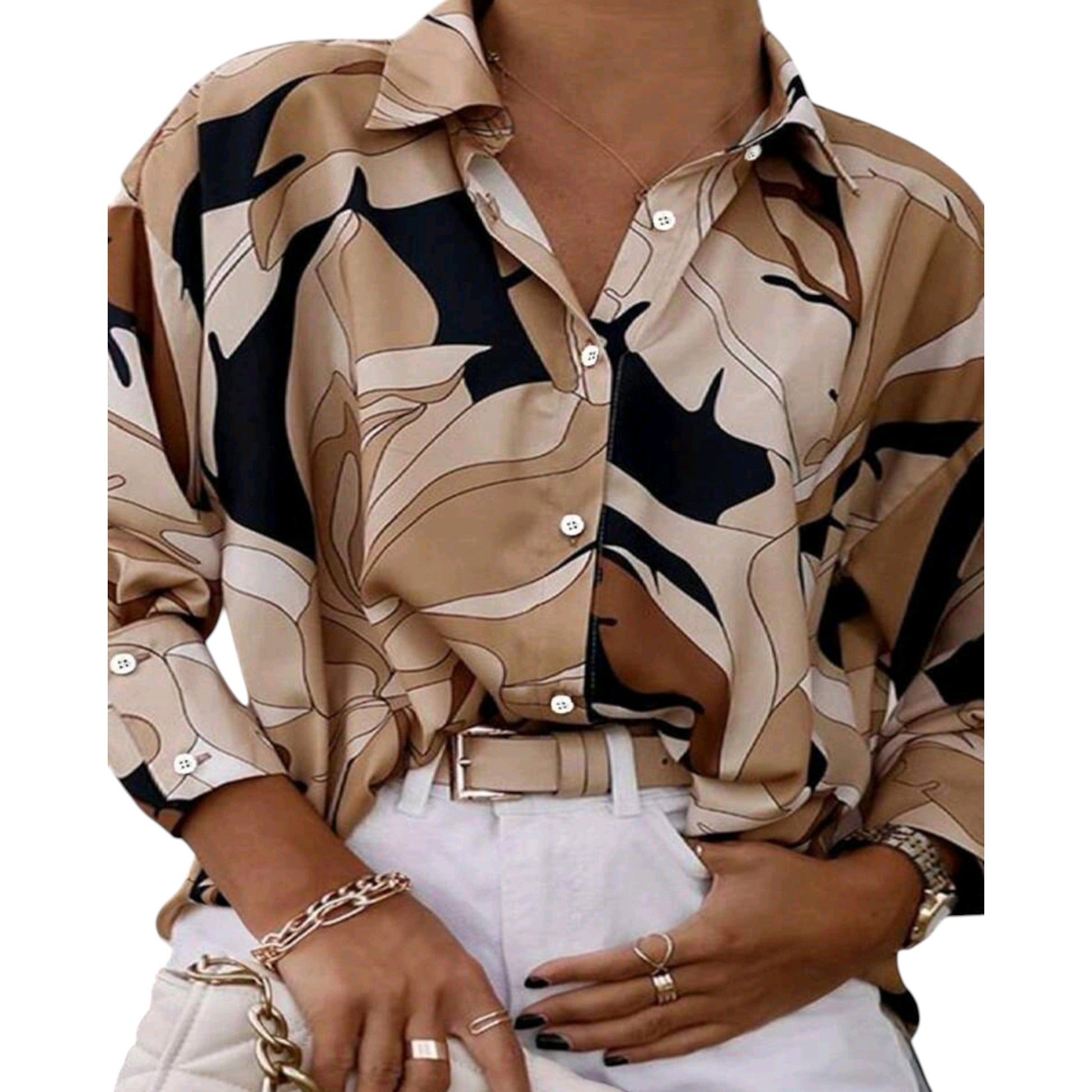 Címke nélküli, bézs, fekete és barna absztrakt mintás, galléros, hosszú ujjú, gombos ingblúz