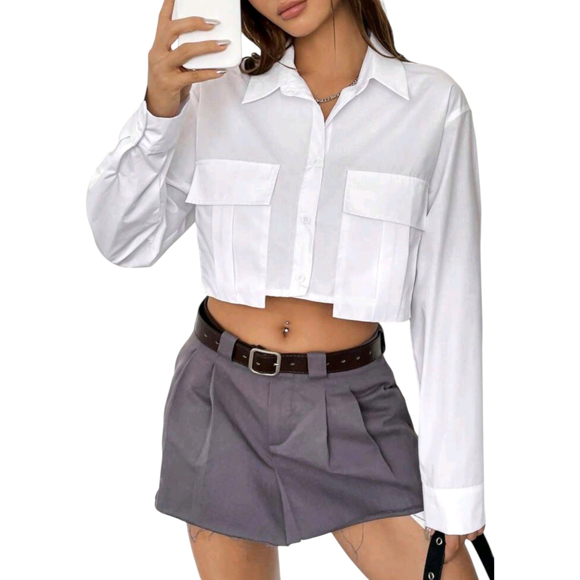 Címke nélküli, fehér, galléros, hosszú ujjú, gombos crop top ingblúz két mellzsebbel
