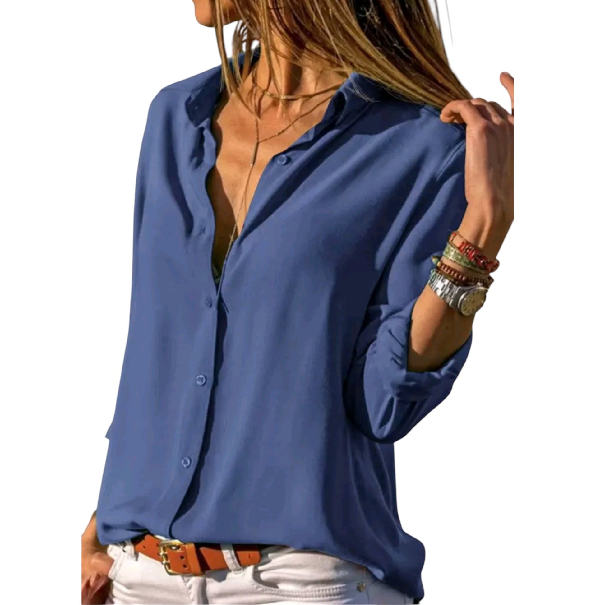 Címke nélküli, kék, galléros, hosszú ujjú, gombos, lekerekített aljú.