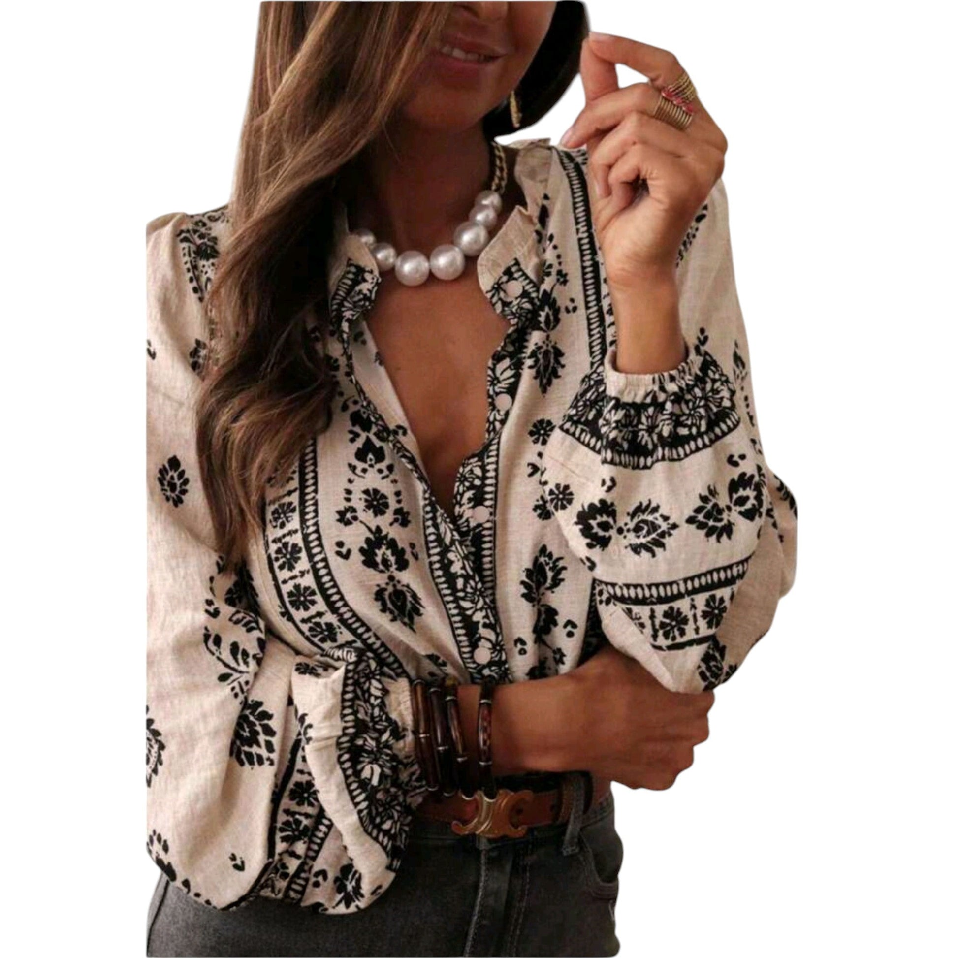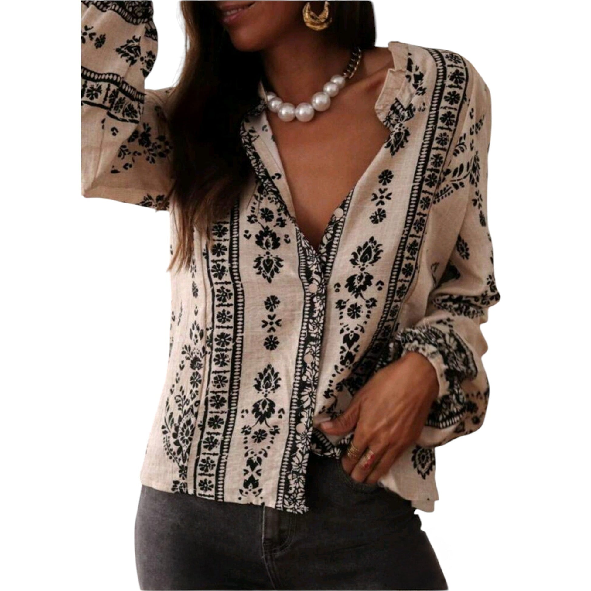 Címke nélküli, bézs, fekete mintás, hosszú ujjú, V-nyakú, galléros.