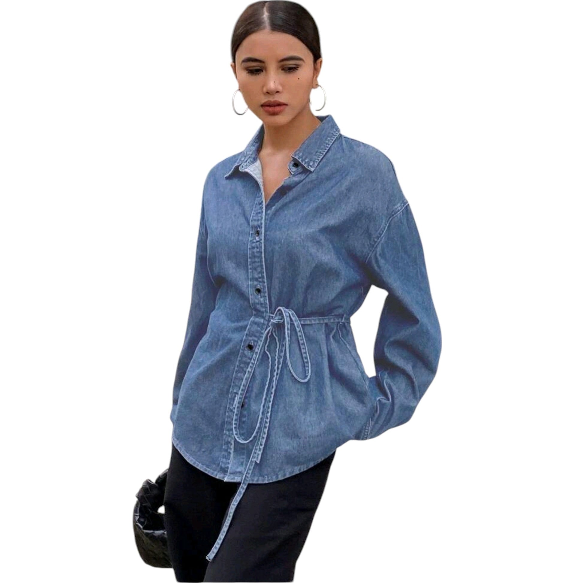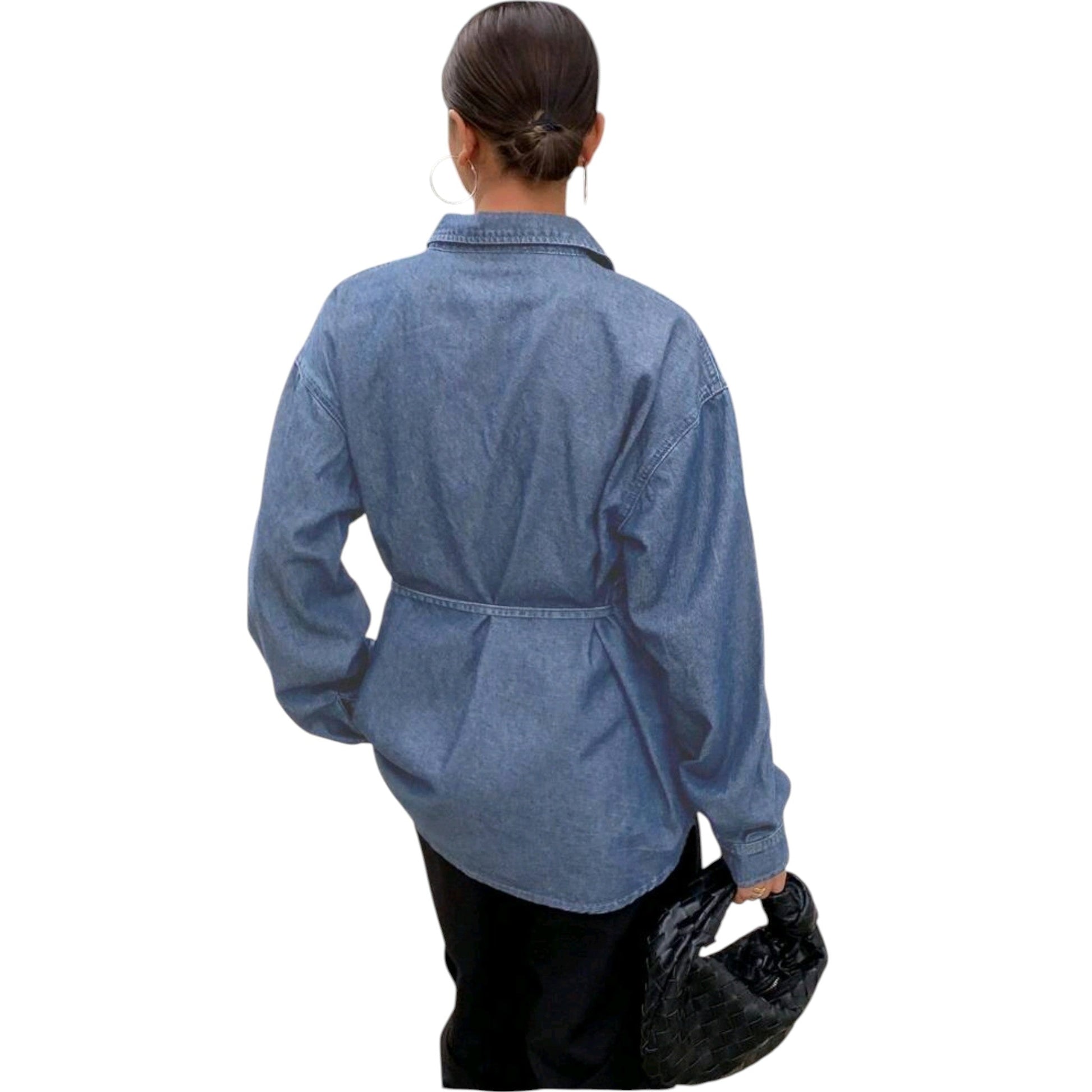 Címke nélküli, kék, hosszú ujjú, galléros, öves, gombos.