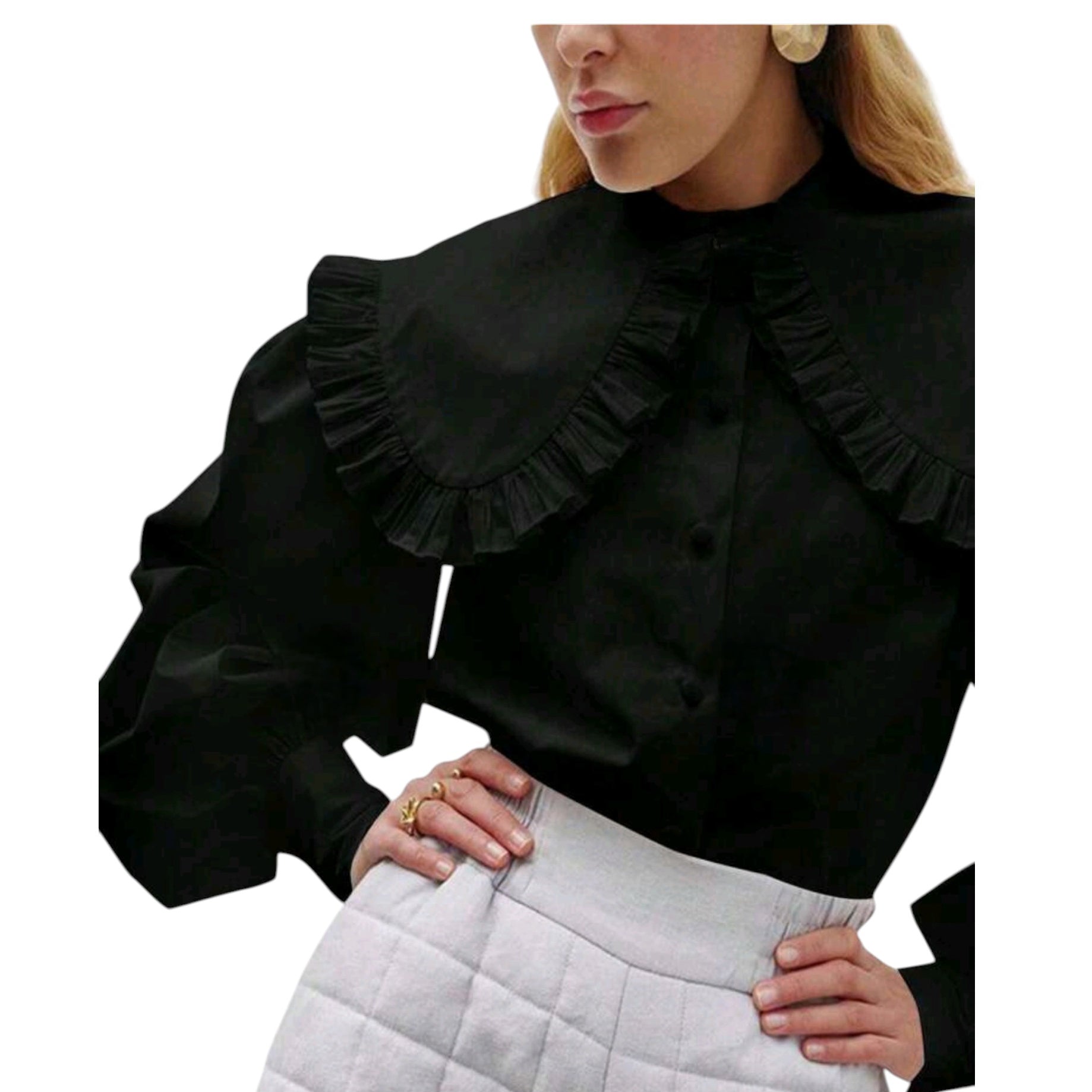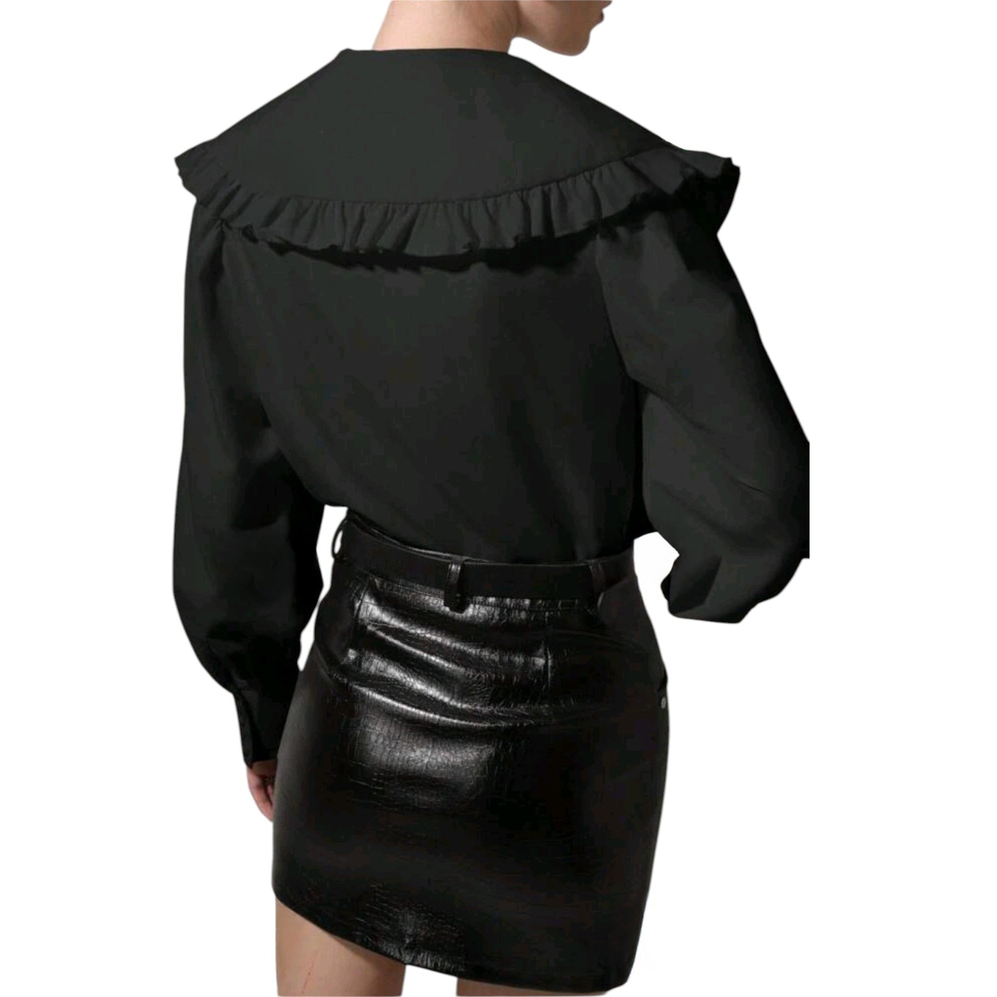 Címke nélküli, fekete, hosszú puffos ujjú, fodros gallérú, gombos.
