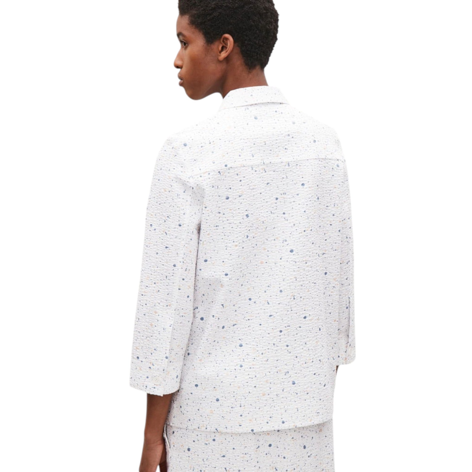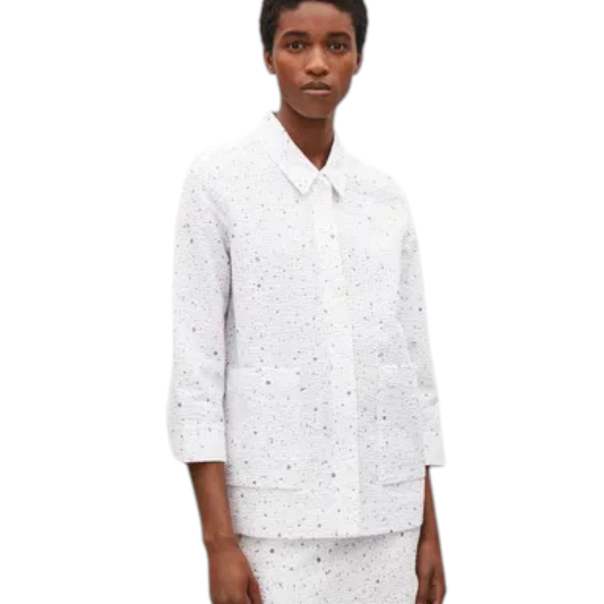 Címke nélküli, fehér és szürke, rövid, ing fazonú kabátka, galléros, elöl gombolásos, 3/4 ujjú, szürke pettyes/texturált mintás, enyhén doboz fazonú, nem rugalmas anyagú.