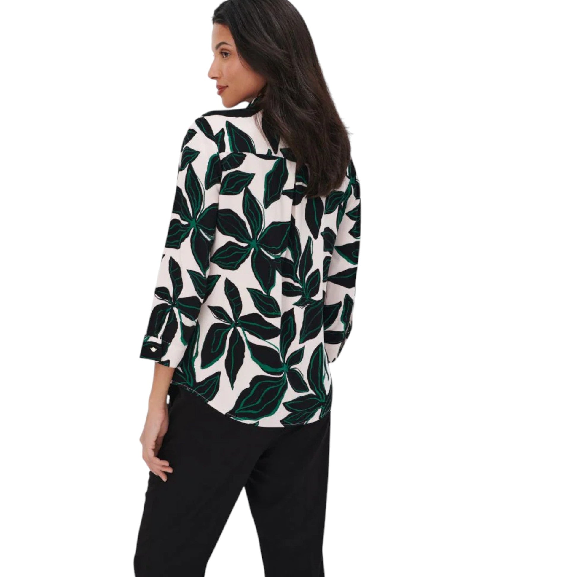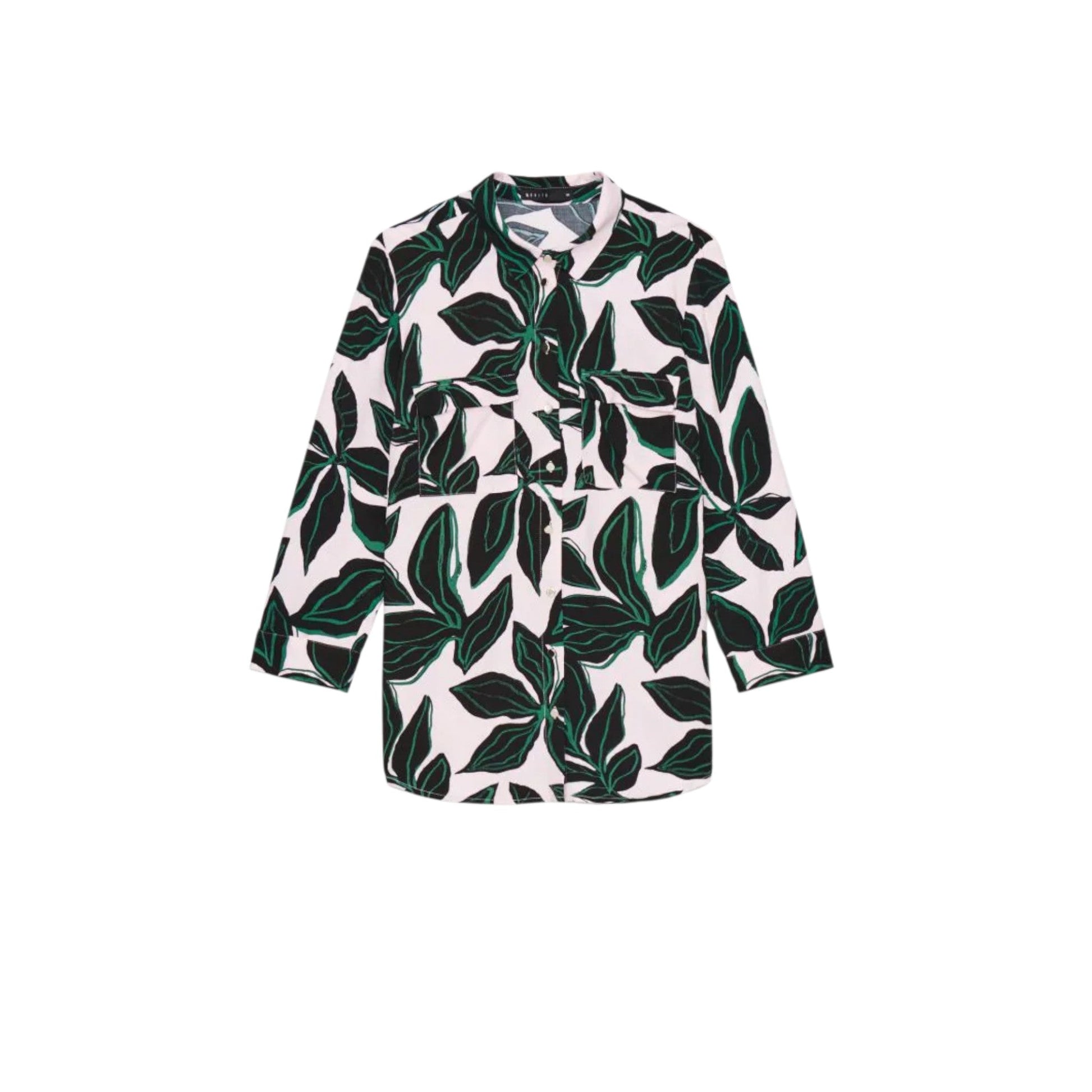 Címke nélküli, fehér, fekete és zöld, hosszú ujjú blúz, álló galléros, elöl gombolásos, 3/4 ujjú, fekete és zöld levél mintás.