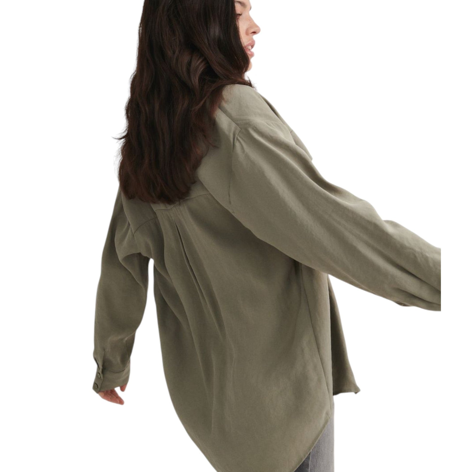 Címke nélküli, khaki zöld, hosszú ujjú, galléros, elöl végig gombolható, két mellzsebbel, enyhén hosszított ing.