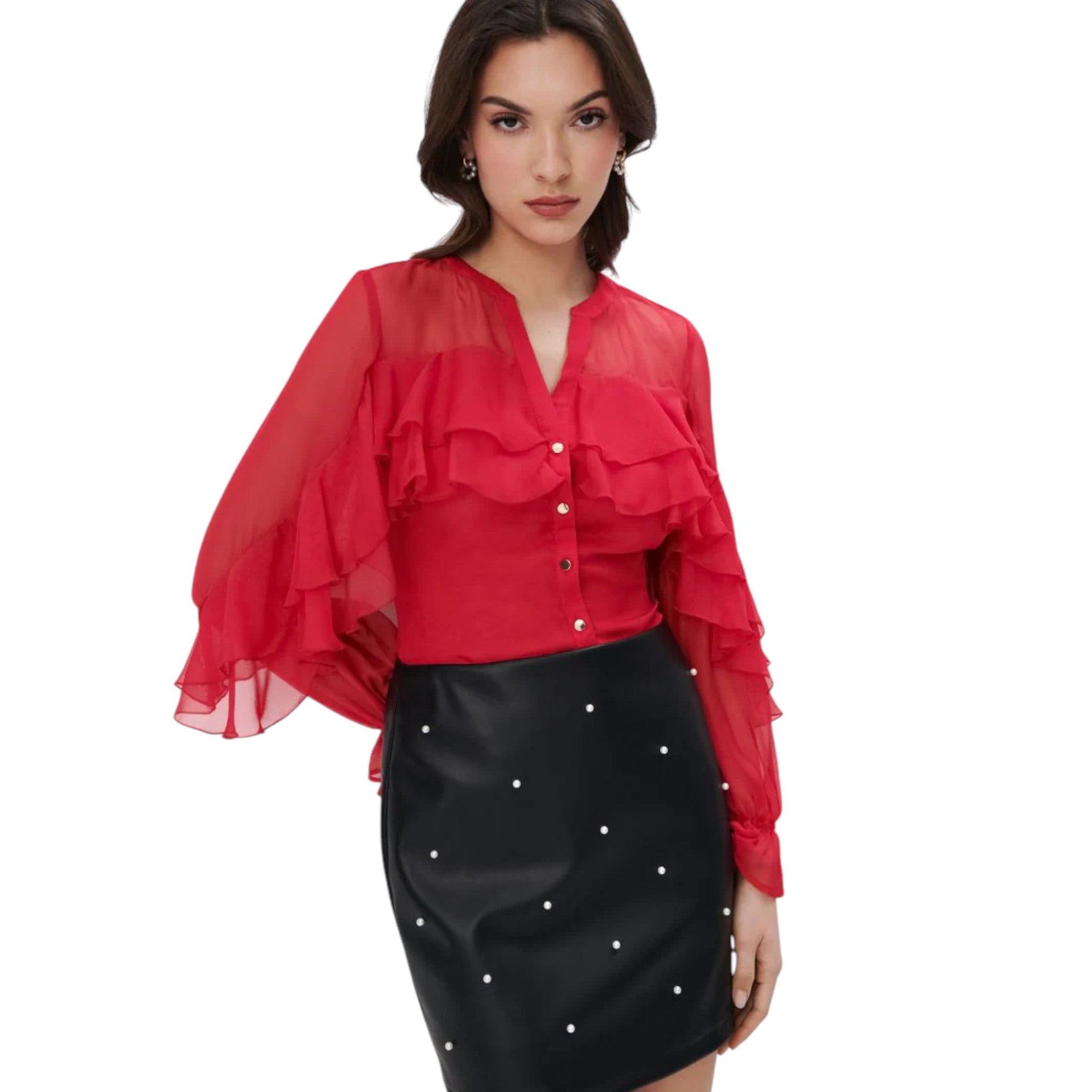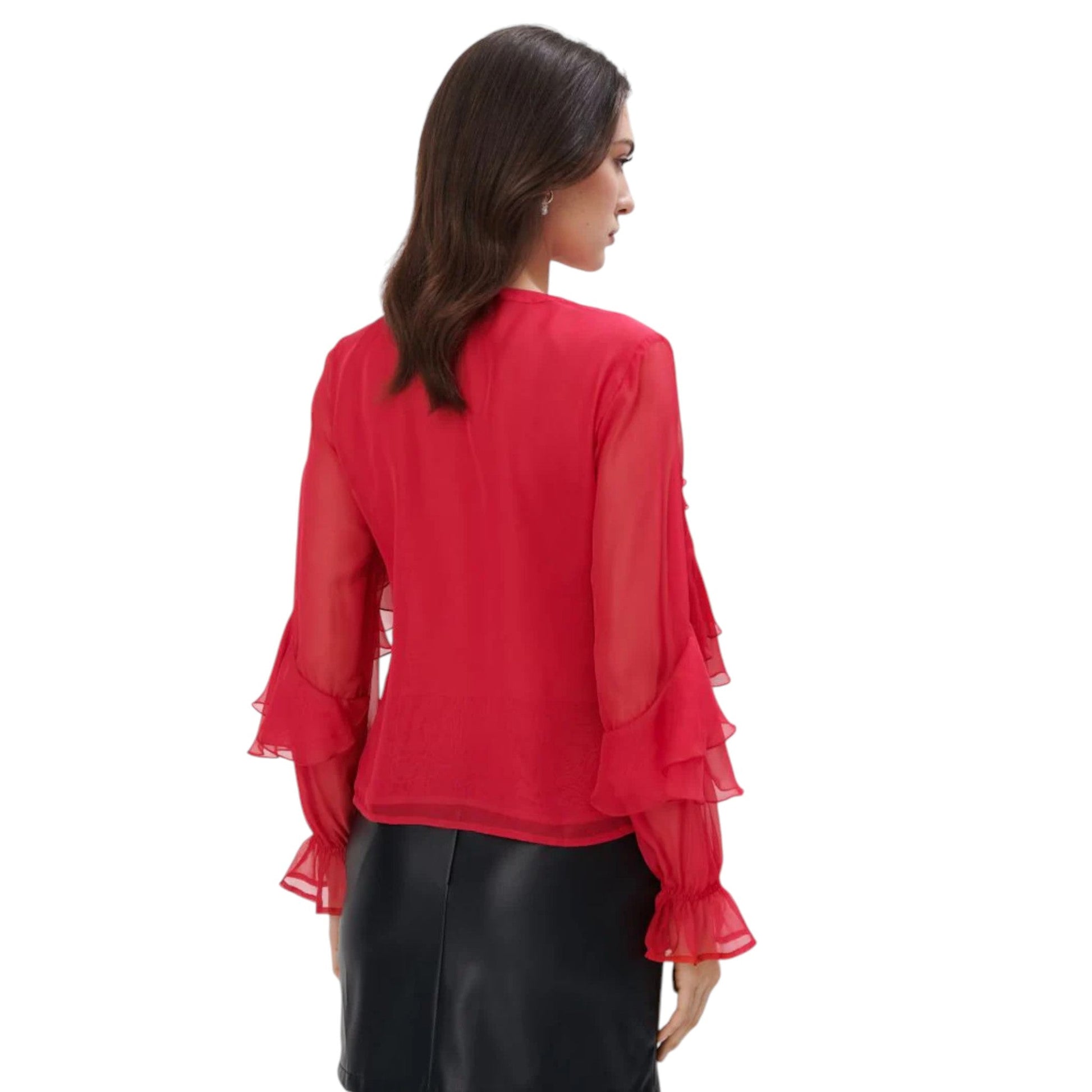 Címke nélküli, piros, hosszú ujjú, ejtett vállú, fodros ujjvégekkel és fodros díszítéssel a mellrészen, V-nyakú, elöl gombolható, enyhén áttetsző blúz.