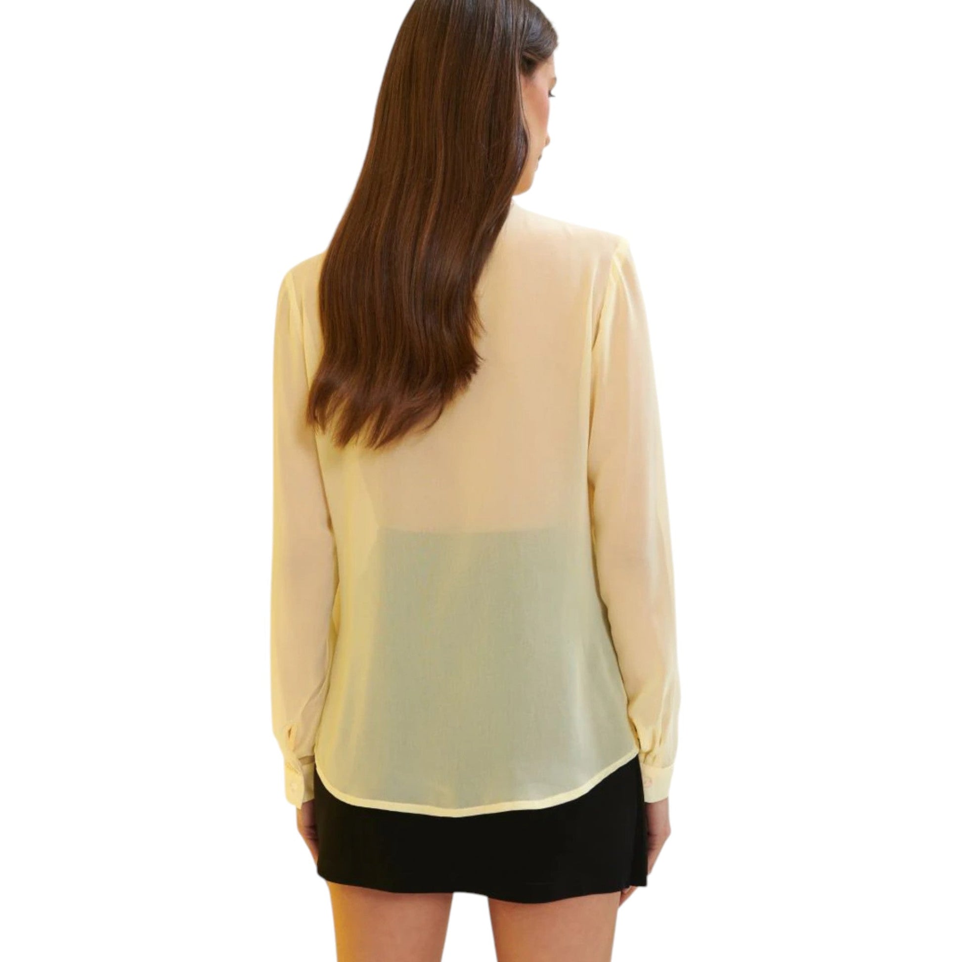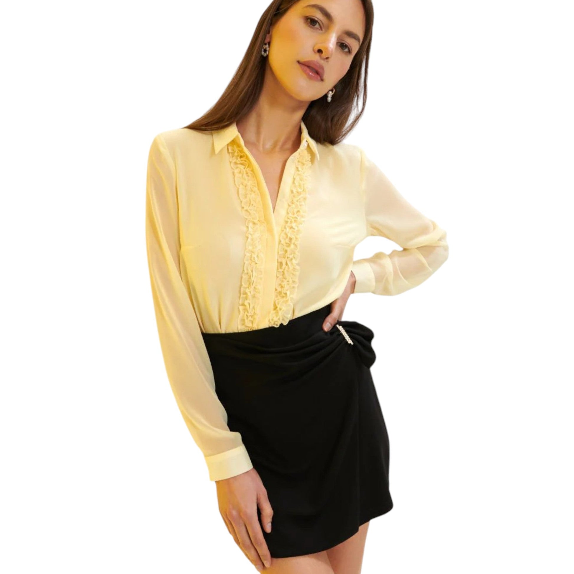 Címke nélküli, sárga, hosszú ujjú, galléros, elöl gombolható, elöl függőleges fodros díszítéssel.