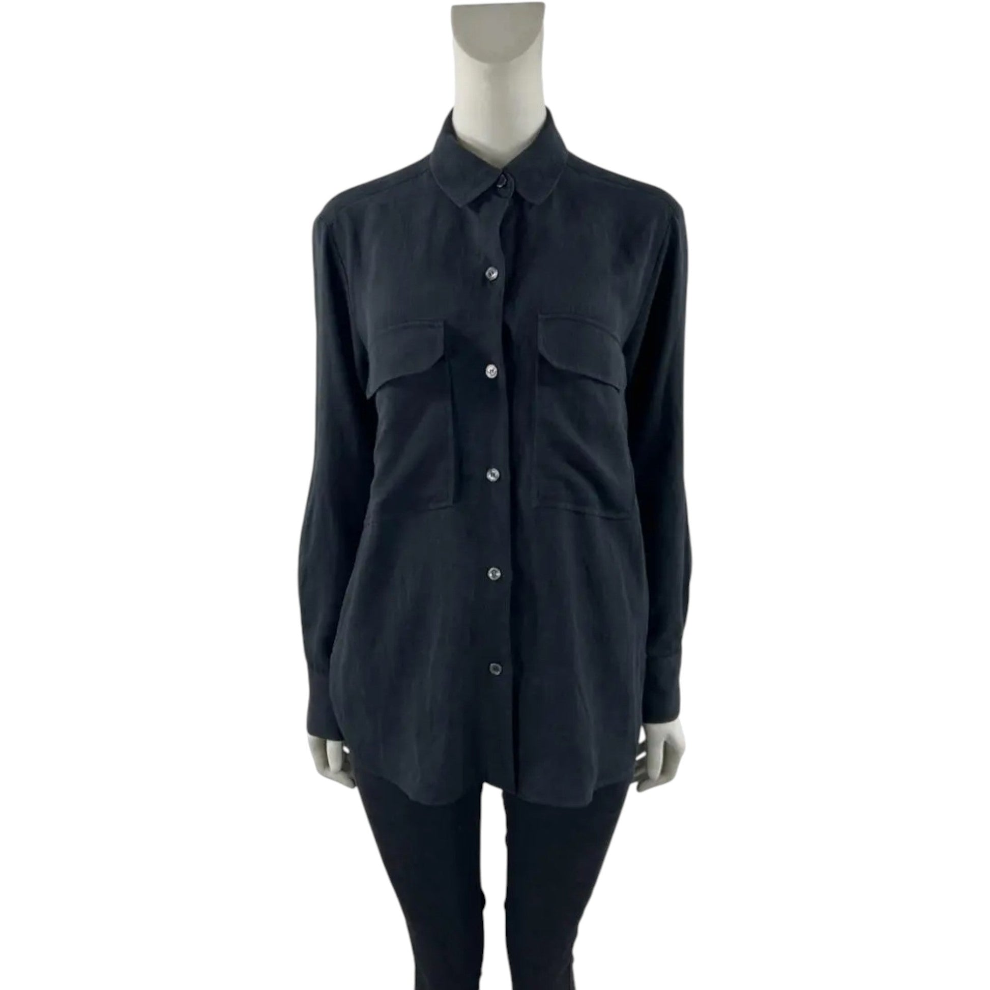 Címke nélküli, fekete, selymes anyagú, galléros, hosszú ujjú, elöl gombolható, normál szabású.