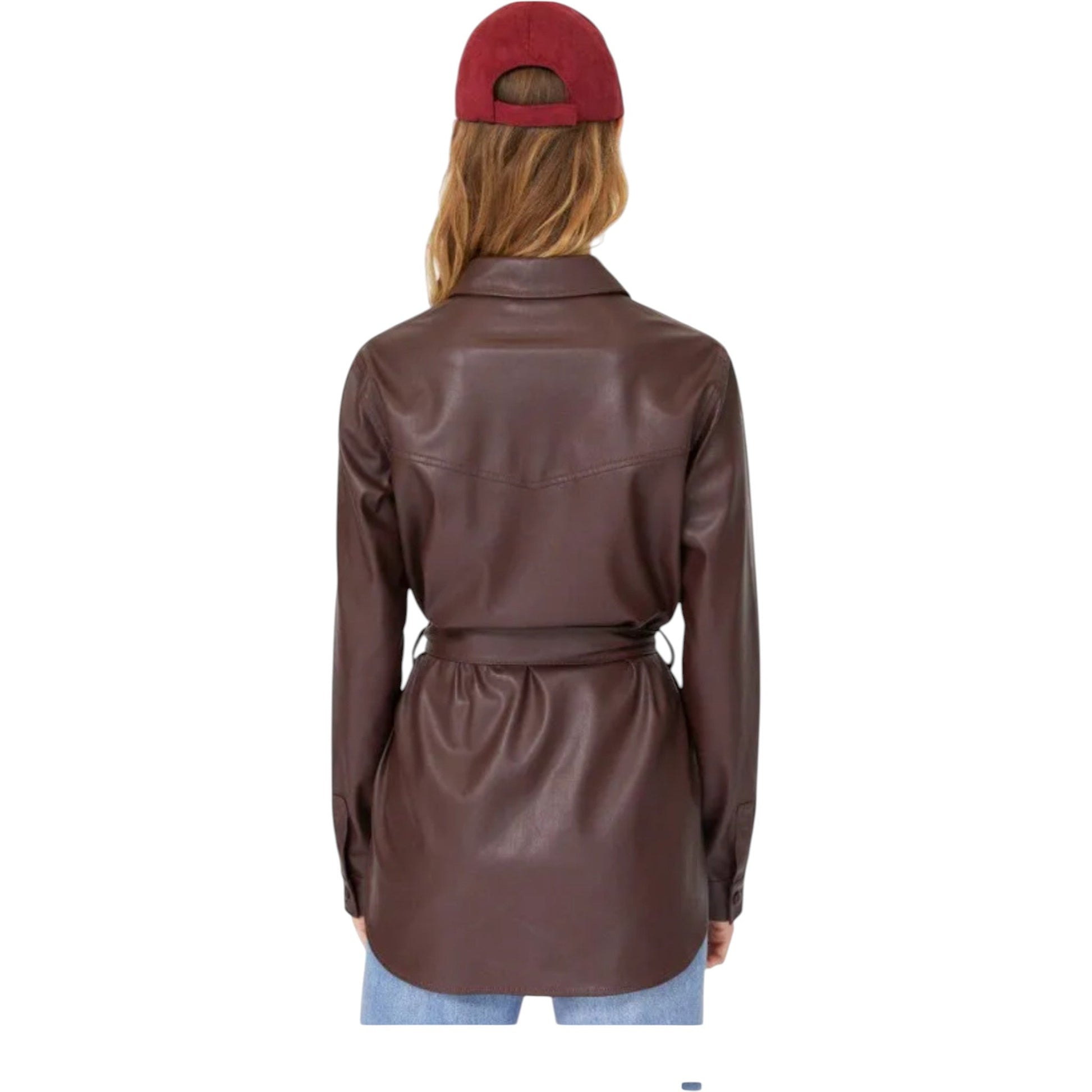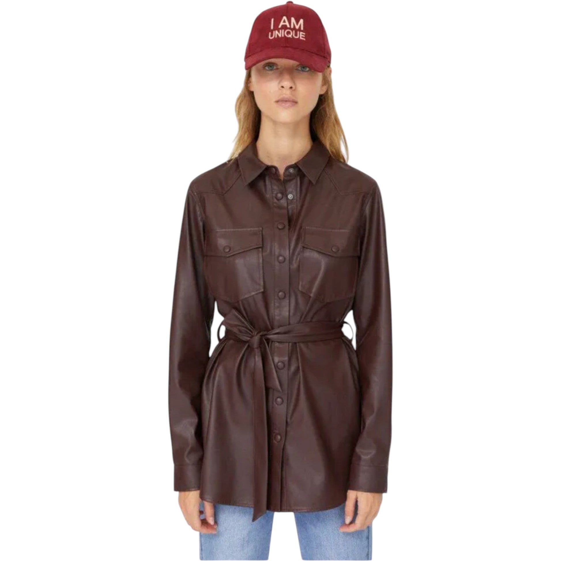 Címke nélküli, barna, műbőr/bőr hatású anyag, hosszú, galléros, hosszú ujjú, elöl gombolható, derékon megkötős, ingkabát fazonú.