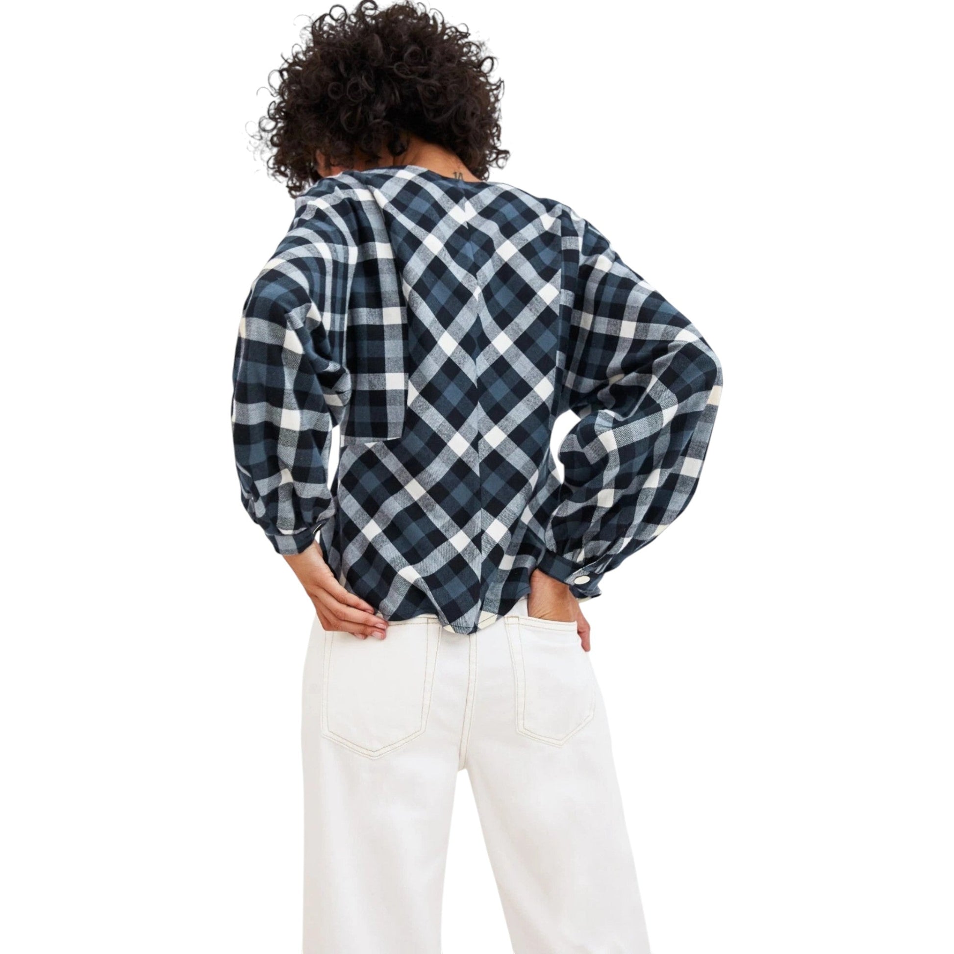 Címke nélküli, fekete, sötétkék és fehér kockás minta, V-nyakú, elöl gombokkal záródó, bővebb/puffos hosszú ujjú.