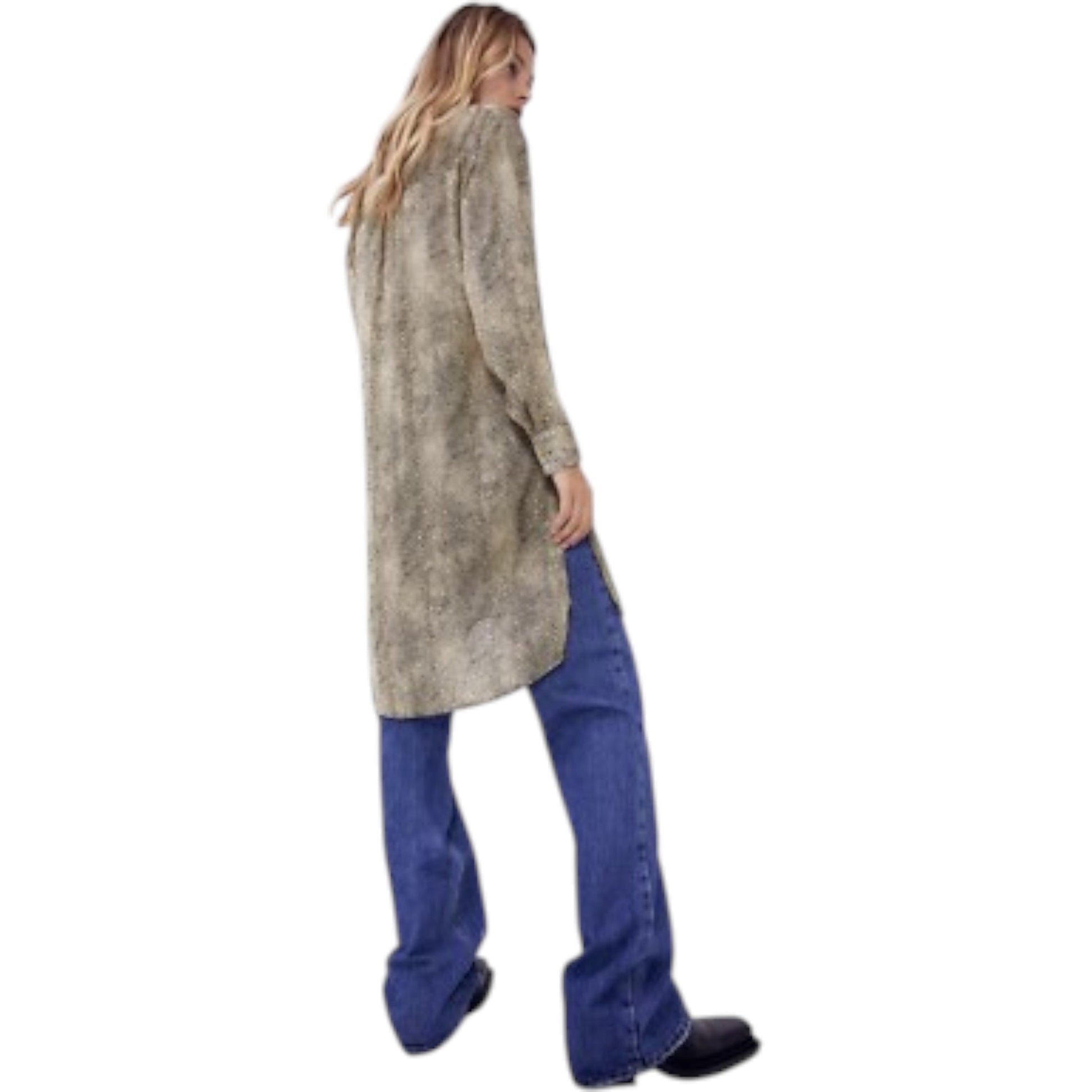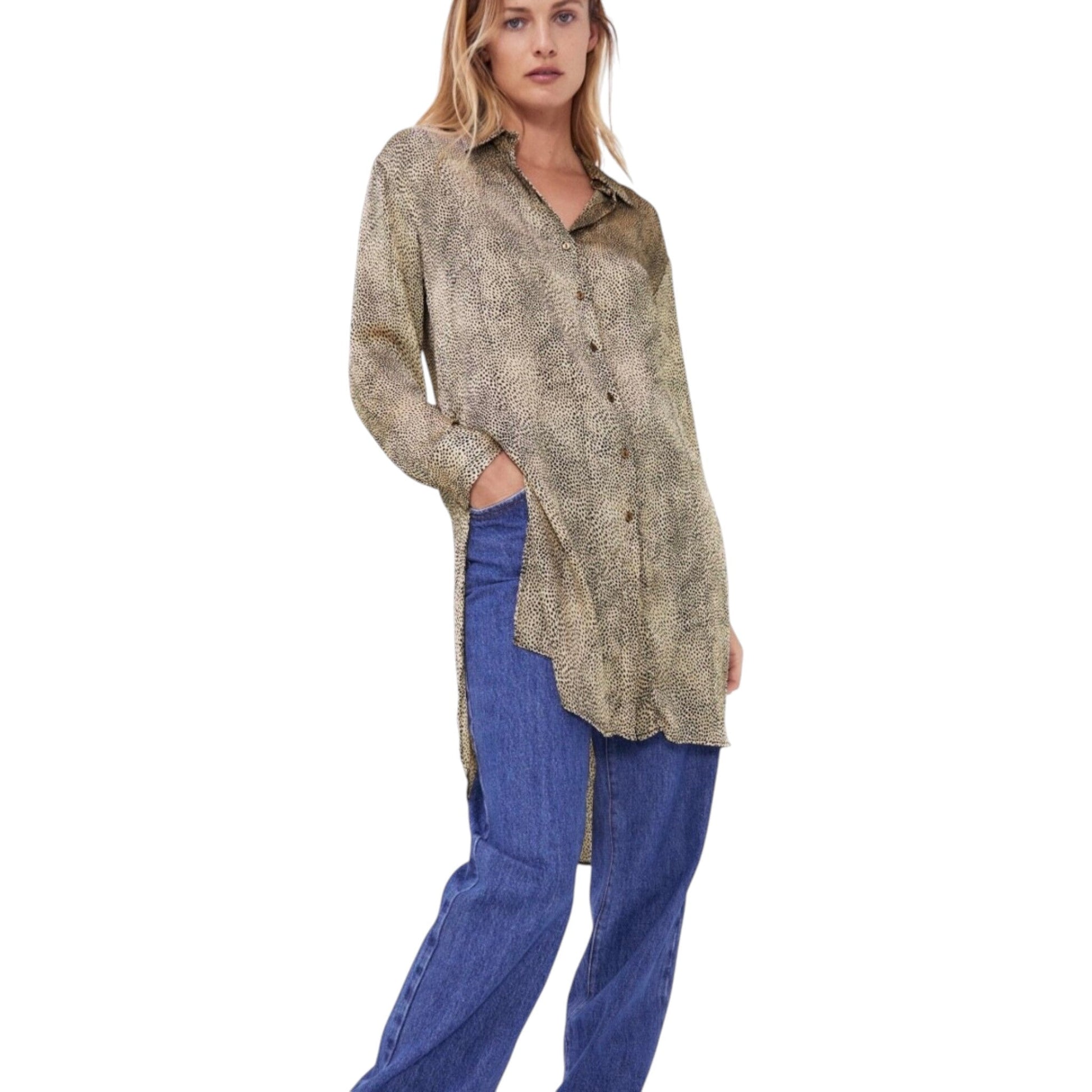 Címke nélküli, bézs alapon sötétbarna apró pöttyös mintás, hosszú ujjú ing, galléros, elöl végig gombos, hosszított tunika szabású, alul oldalt felsliccelt, kerekített aljú.