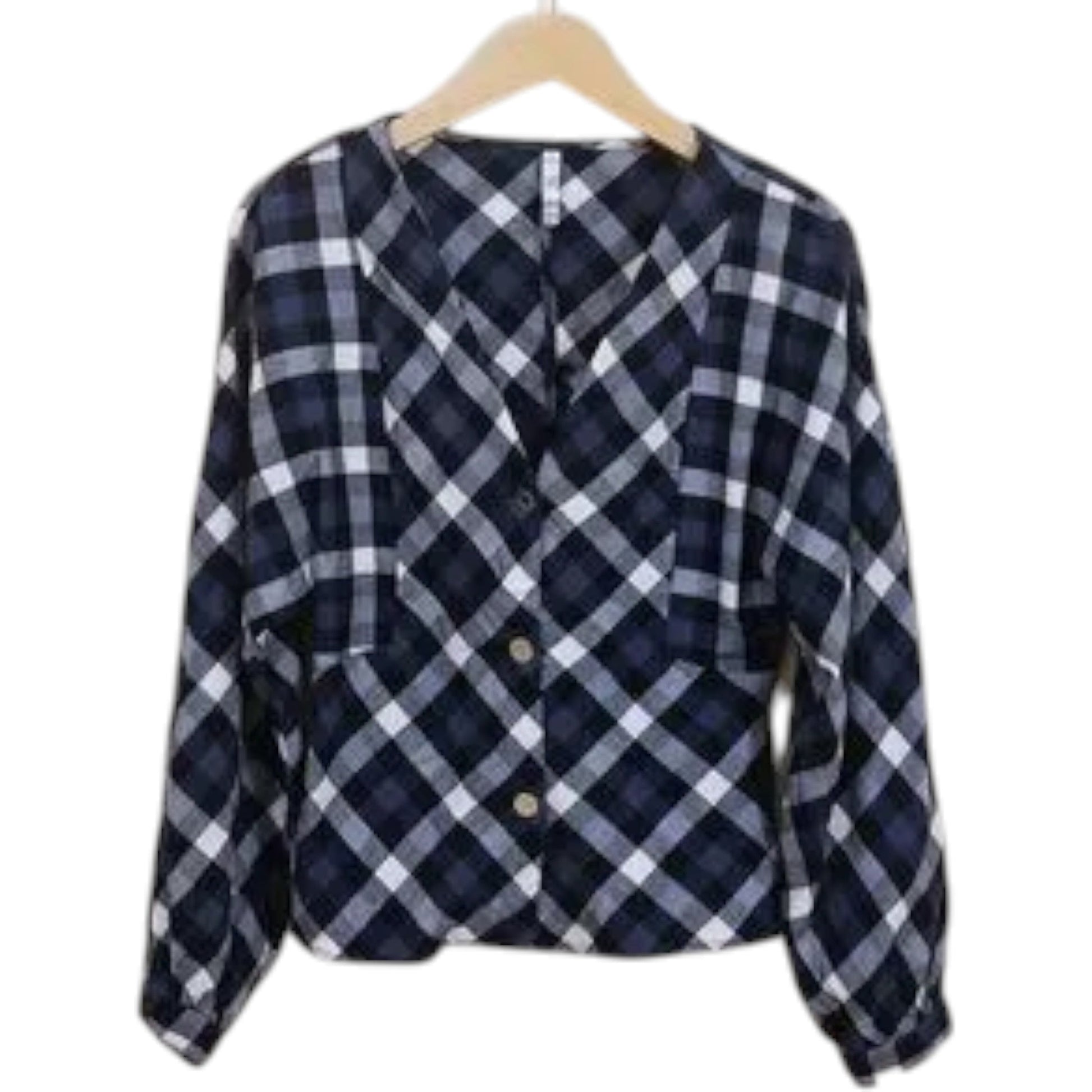 Címke nélküli, fekete, sötétszürke és fehér kockás mintájú, hosszú ujjú blúz, V-nyakú, enyhén crop szabású, elöl 3 gombbal záródó, ejtett vállú, gumírozott szélű, puffos ujjakkal.
