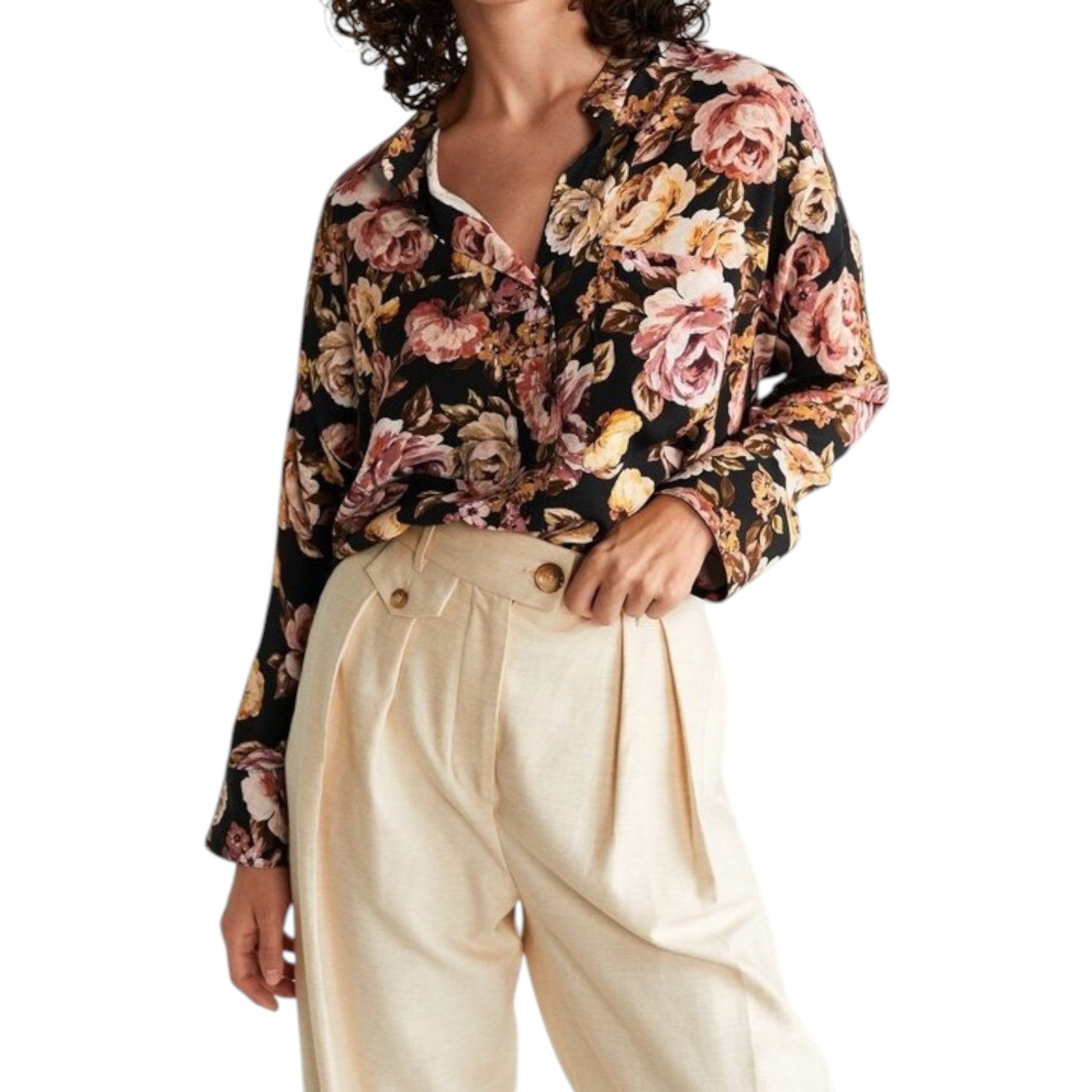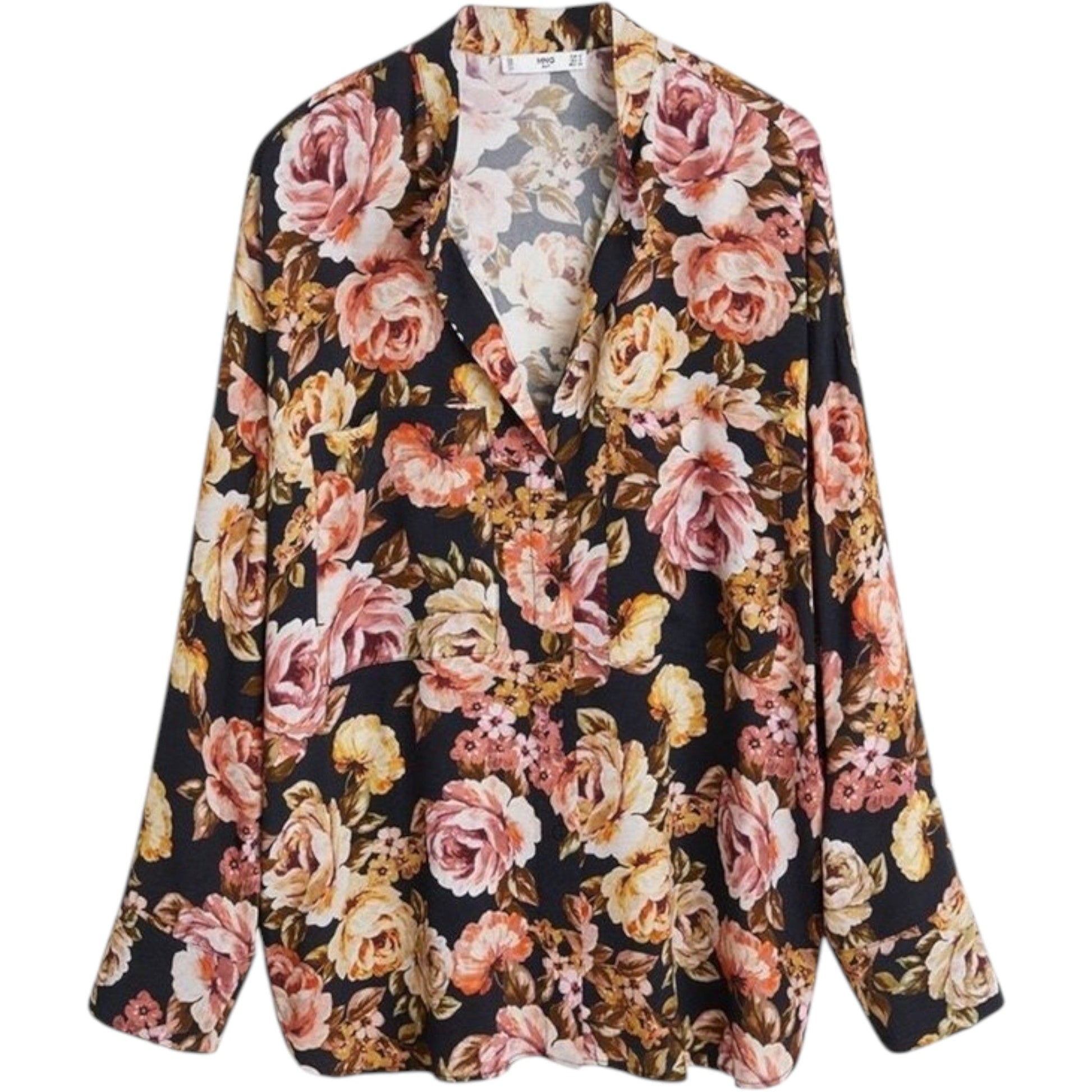 Címke nélküli, fekete alapszínű, nagy rózsaszín, sárga és barna virágmintás, hosszú ujjú blúz, V-nyakú (hajtóka nélküli gallérral), elől rövid gombos záródással.
