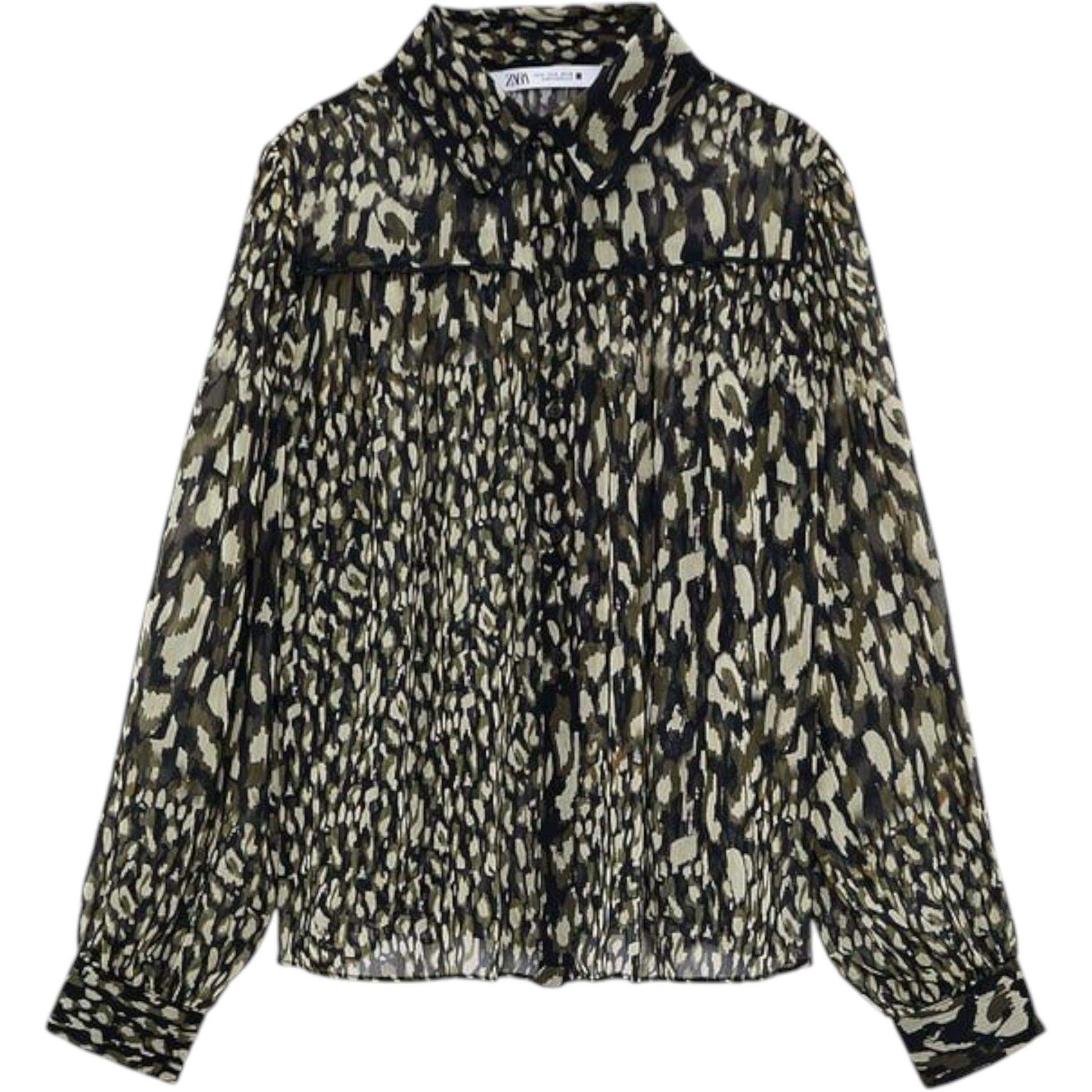Címke nélküli, átlátszó, pliszírozott (hosszanti redőzött) anyagú, fekete, zöld, bézs állatmintás (leopárd/kamuflázs) ing, galléros, hosszú ujjú, gombos, húzott mandzsettával.