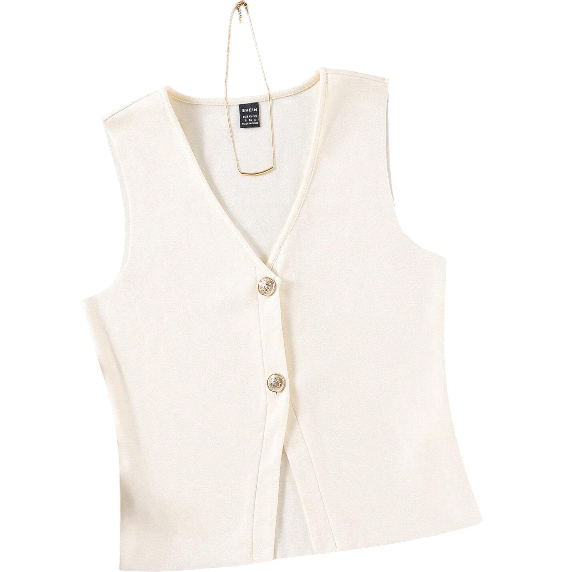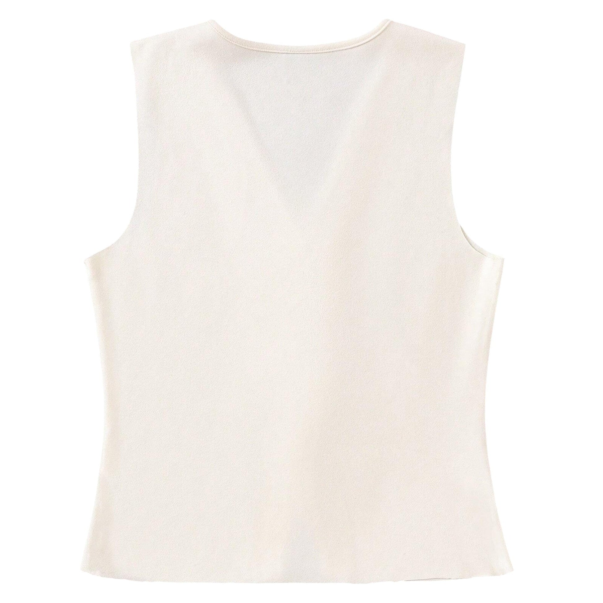 Címke nélküli, törtfehér, ujjatlan, V-nyakú, elöl gombos záródás.