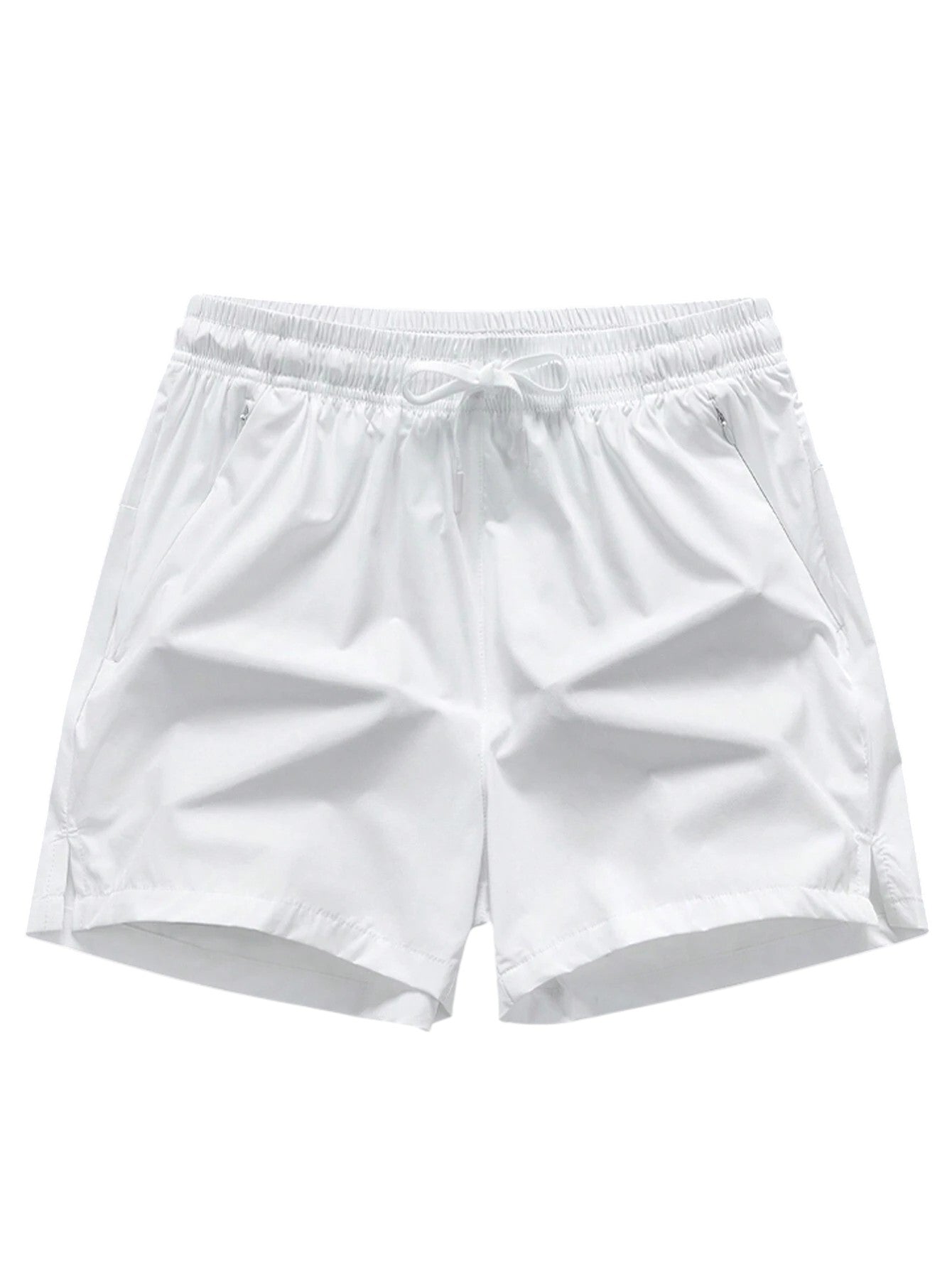 Címke nélküli, fehér, húzózsinóros derék, cipzáras zsebekkel sport rövidnadrág