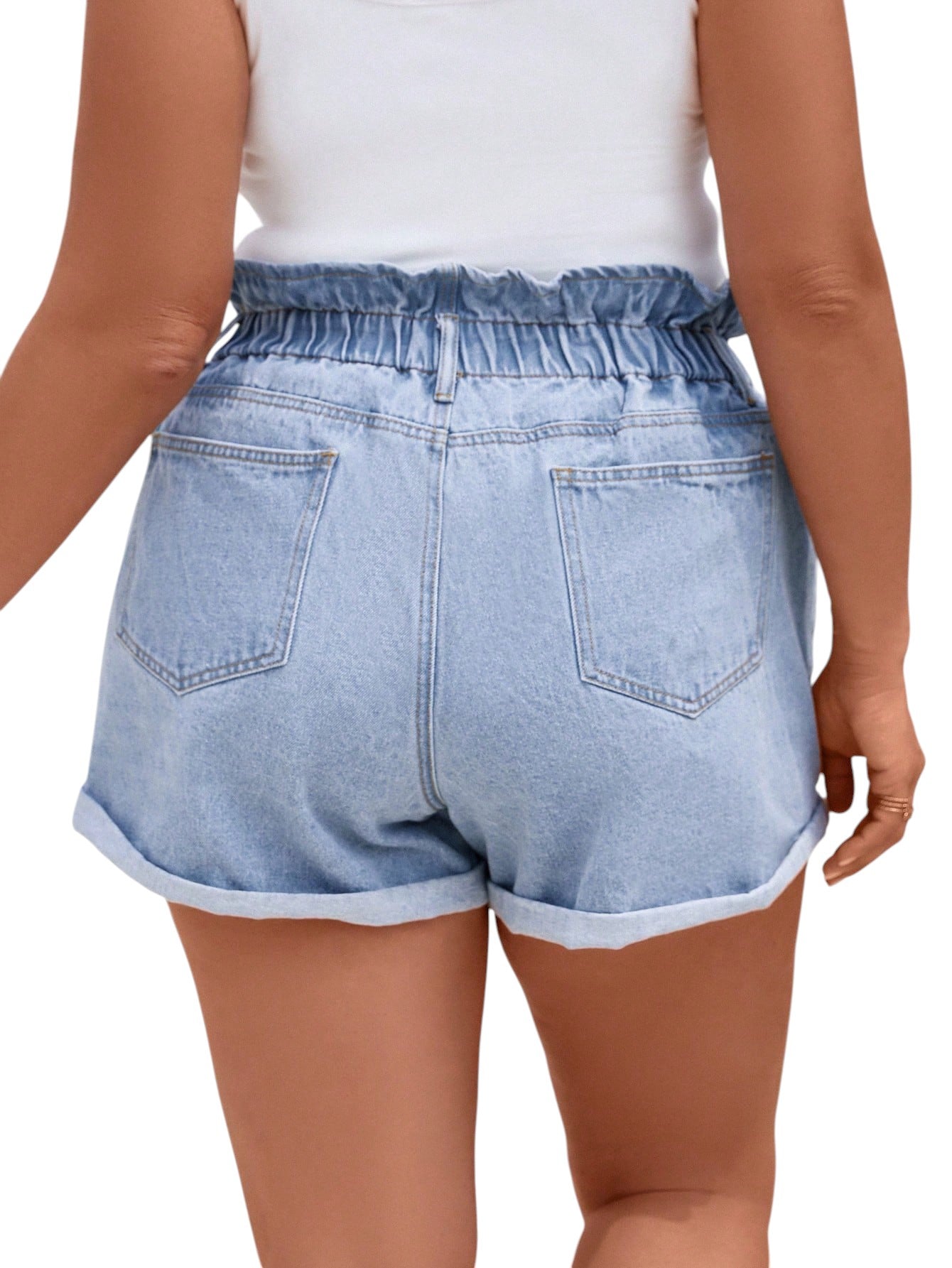 Címke nélküli, világoskék, magas papírzacskó derekú, felhajtott szárú farmer rövidnadrág