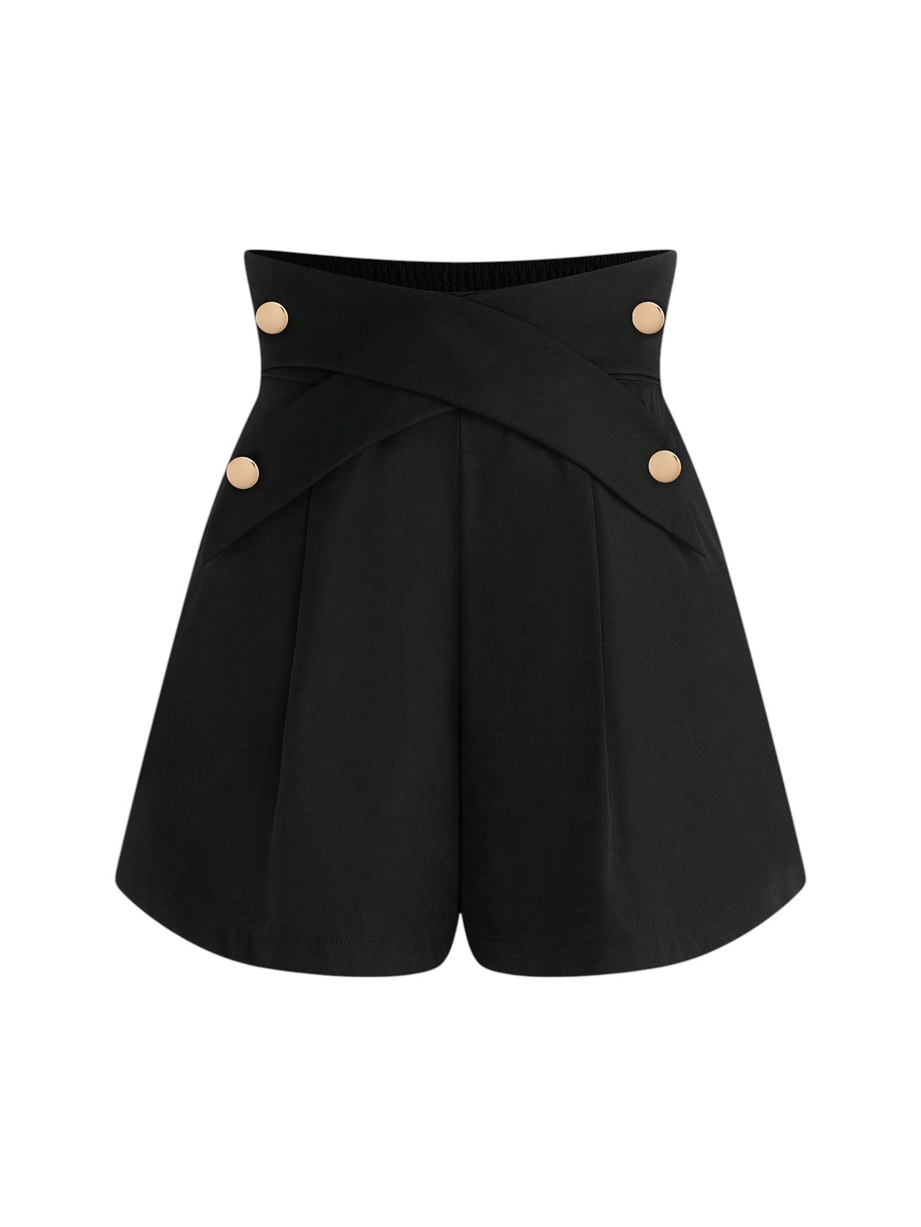 Címke nélküli, fekete, magas derekú, keresztpántos, rakott short arany színű gombokkal