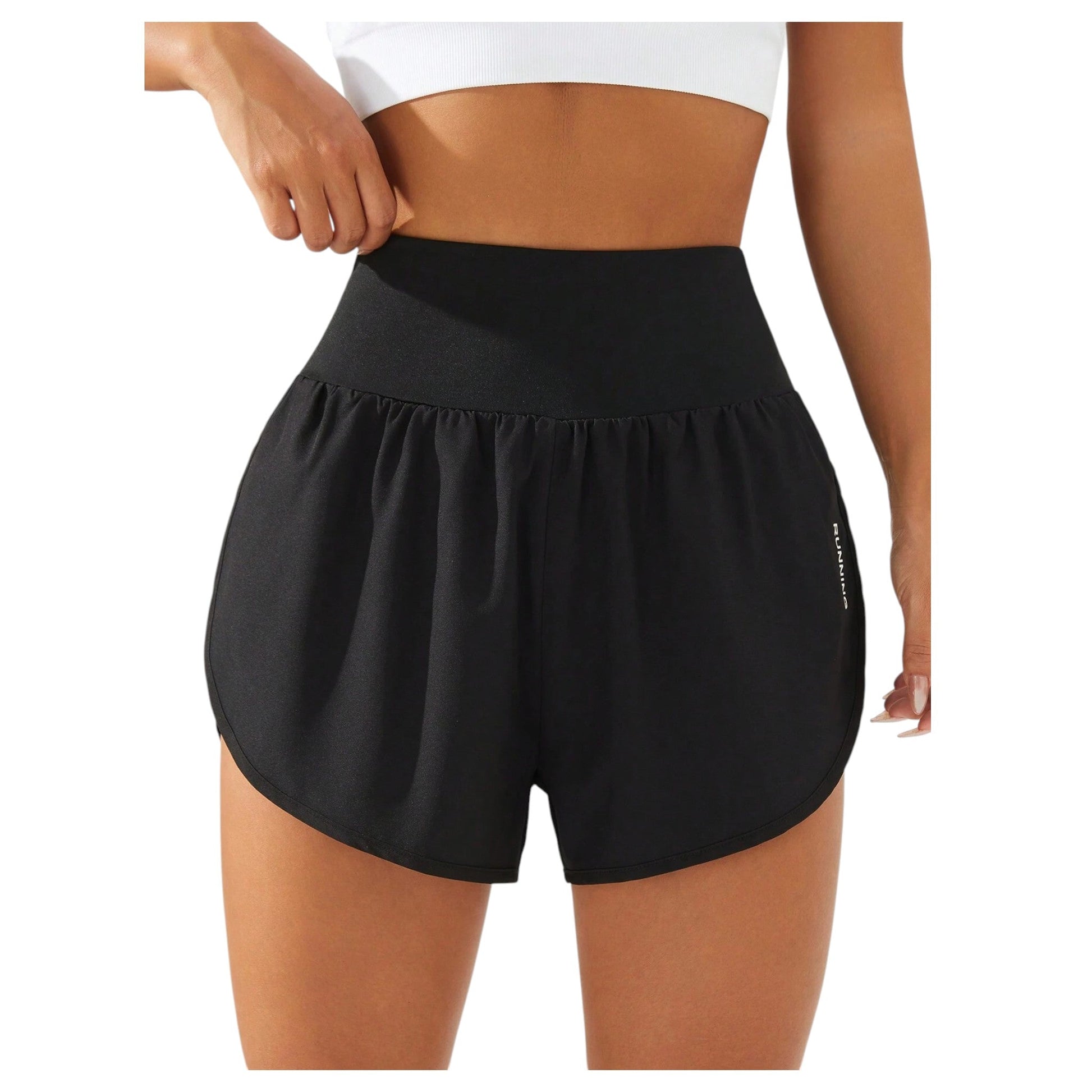 Címke nélküli, fekete, magas derekú, laza szabású futó rövidnadrág ráncolt derékpánttal és ívelt szegéllyel.