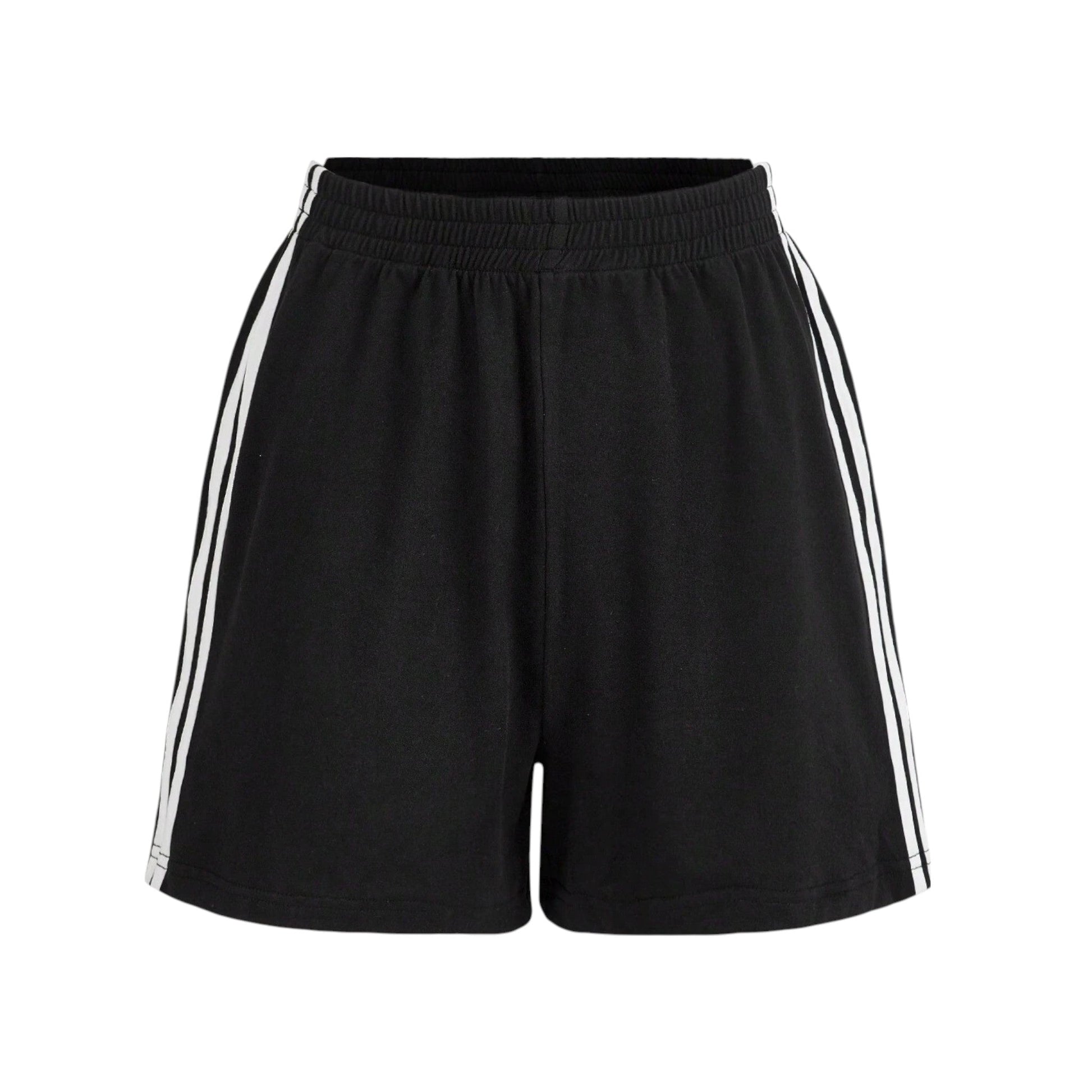 Címke nélküli, fekete színű, elasztikus derekú sport rövidnadrág, fehér csíkokkal az oldalán.