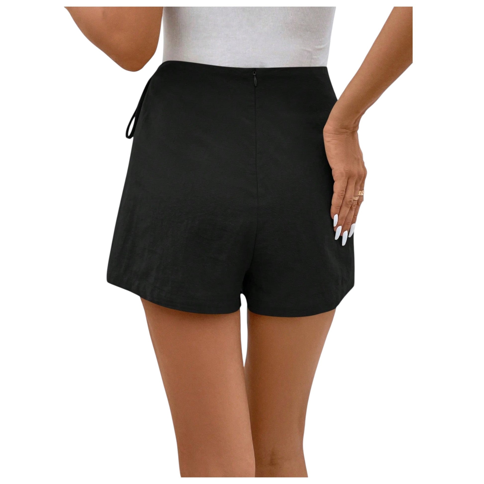 Címke nélküli, fekete, rövid fazon átlapolt szoknyanadrág.