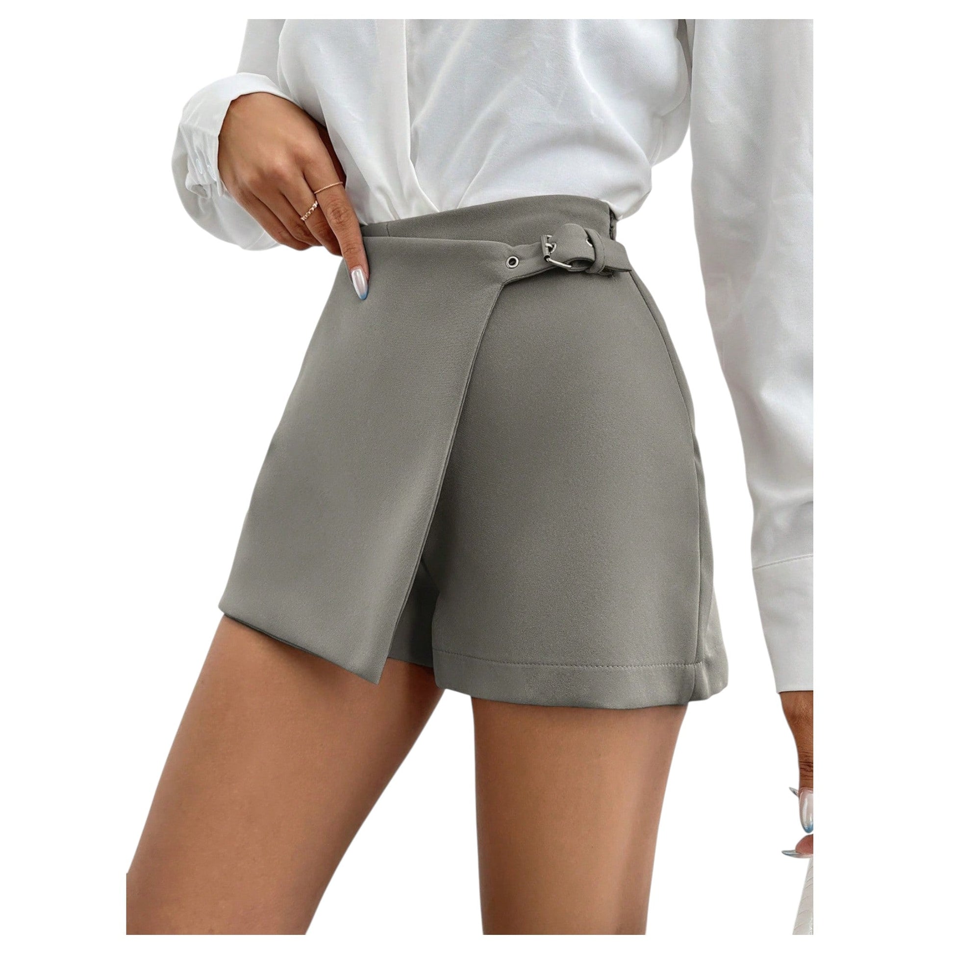 Címke nélküli, szürke, magas derekú, öves, átlapolt szoknyás rövidnadrág.