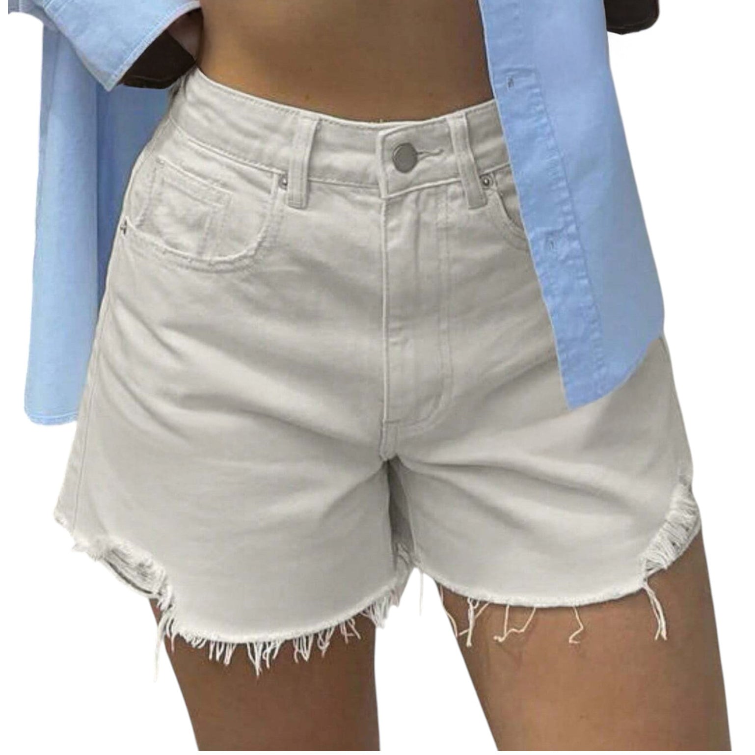 Címke nélküli, fehér, magas derekú, rövid farmernadrág, szaggatott alj, zsebes, gombos és cipzáras záródású.